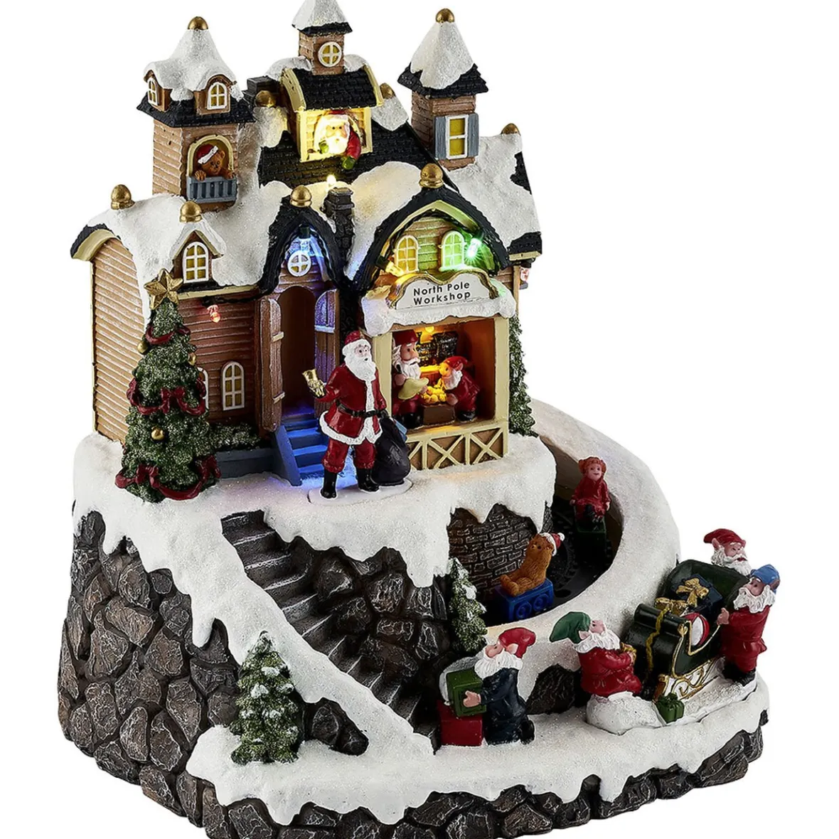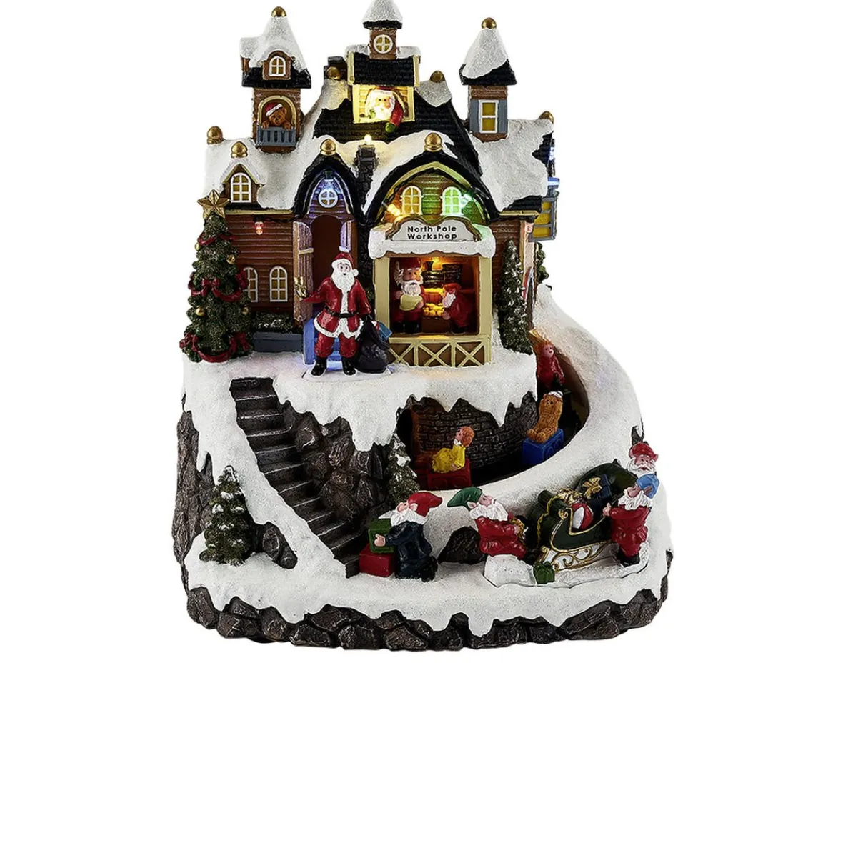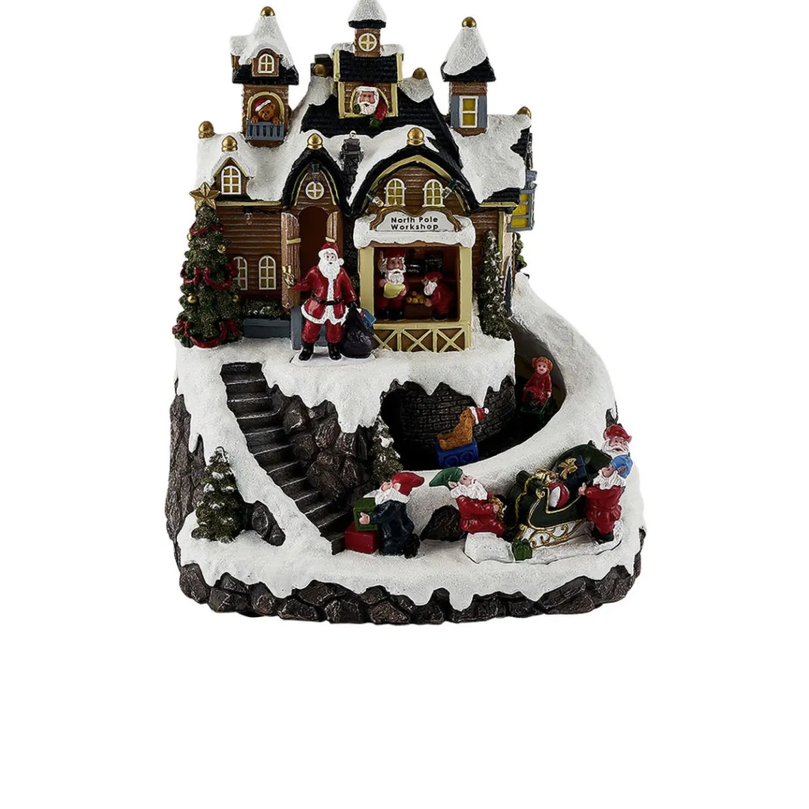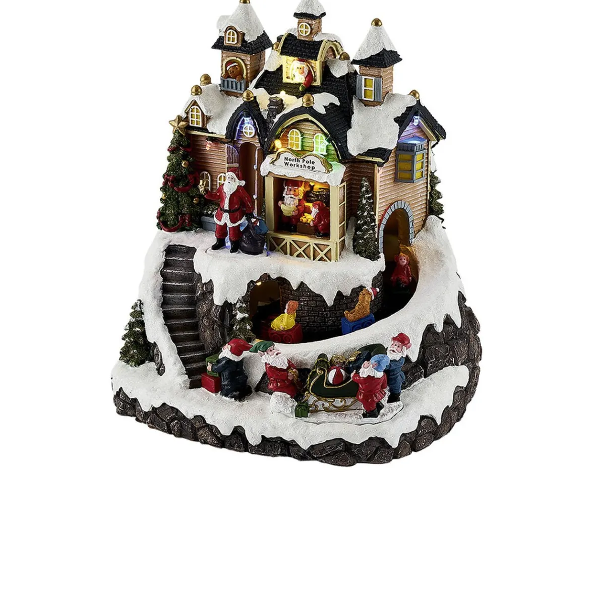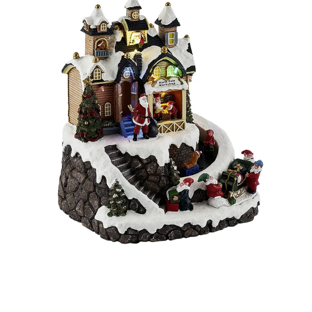 Atelier du Père Noël lumineux, animé et musical à LEDs multicolores fixes.