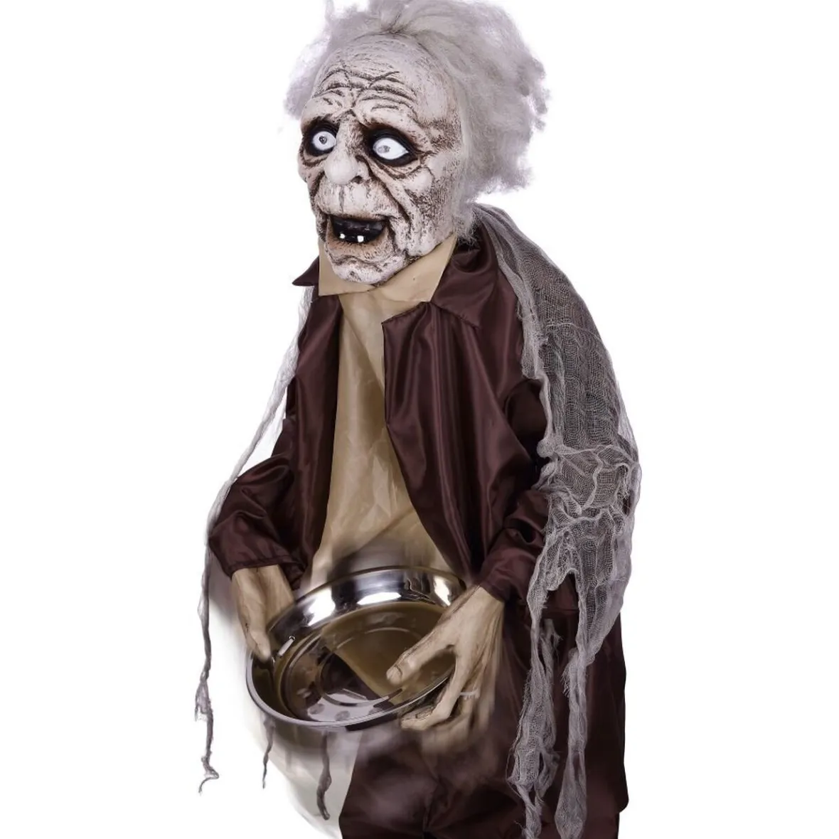 Mécanique, ce vieil homme de 150 cm de haut est doté de mouvements visuels et sonores, évoquant une présence vivante effrayante.