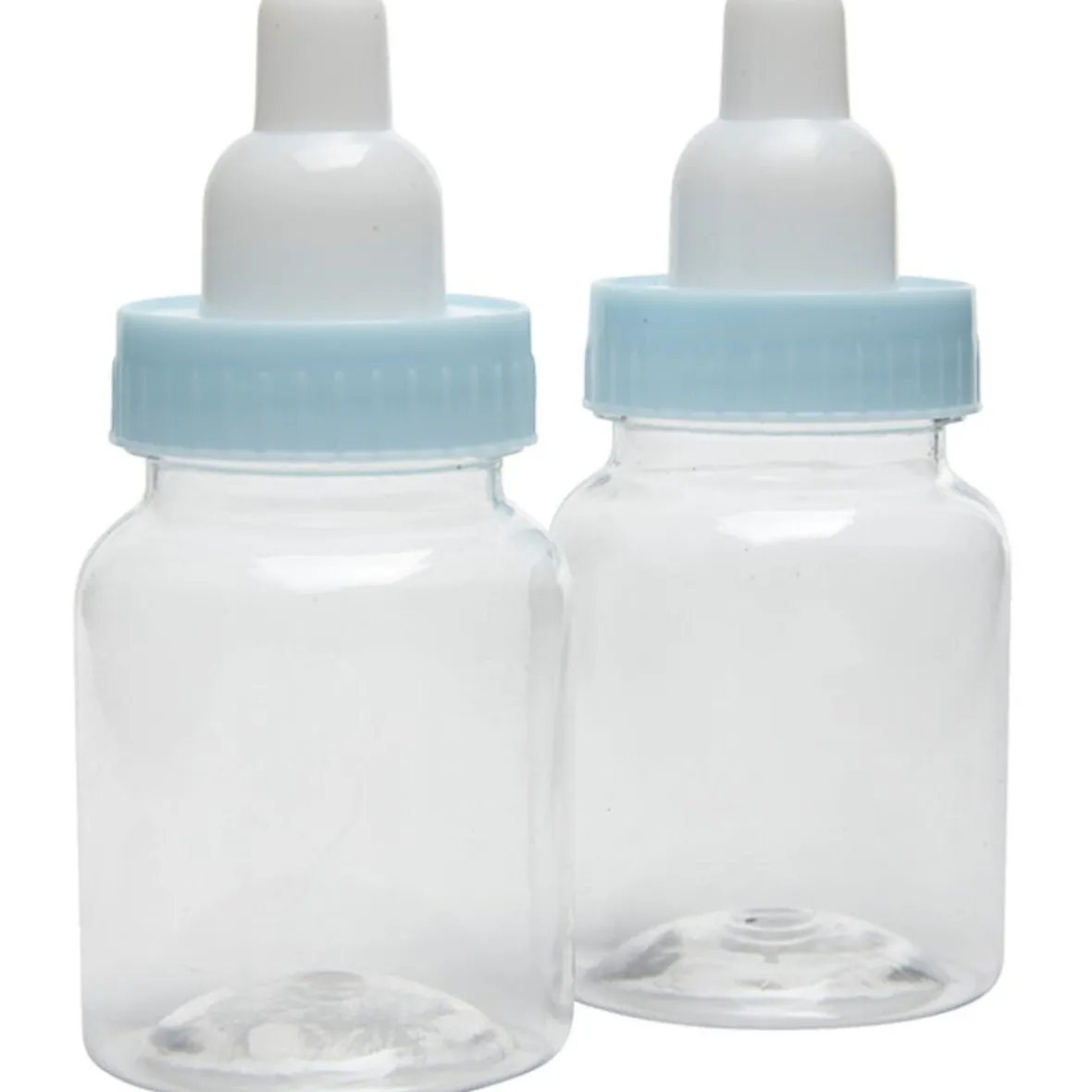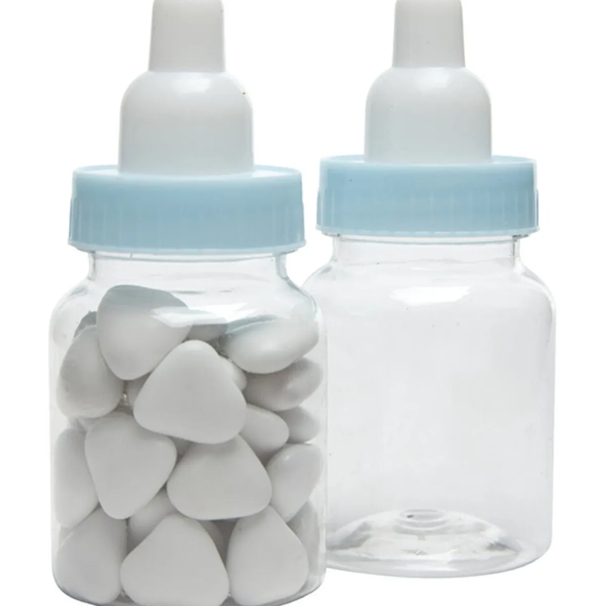 4 biberons bleus, contenant à dragées, dim. h.9xø4 cm, plastique. Vendu sans dragées. Idéal pour vos évènements tels que baptême ou communion.