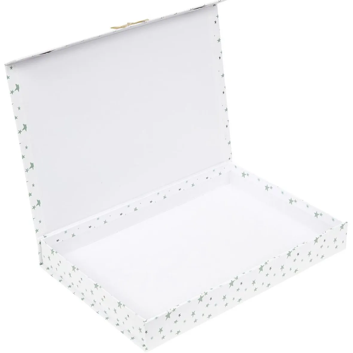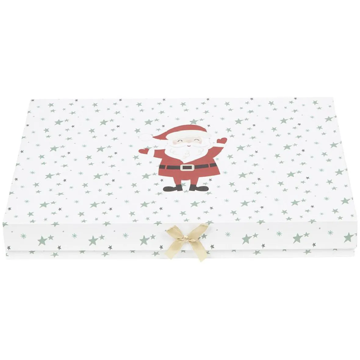 Boîte à cadeau de couleur blanche pour enfant, décorée d’un Père Noël, d’étoiles et d’un petit noeud jaune.