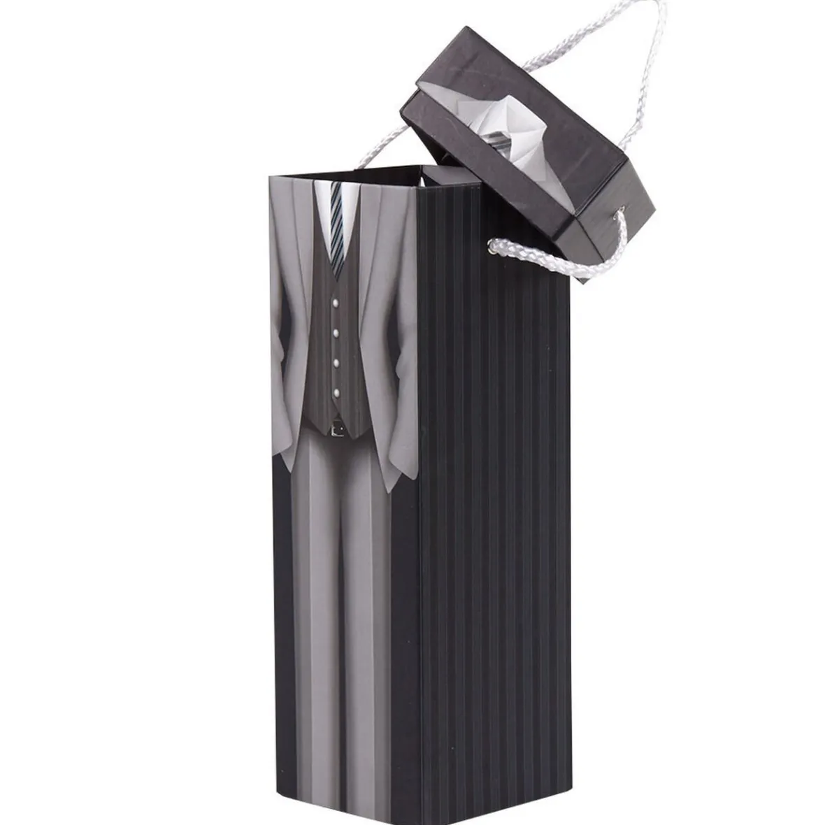 Boîte porte bouteille en carton design costume, dim. 10x10x33,5 cm.