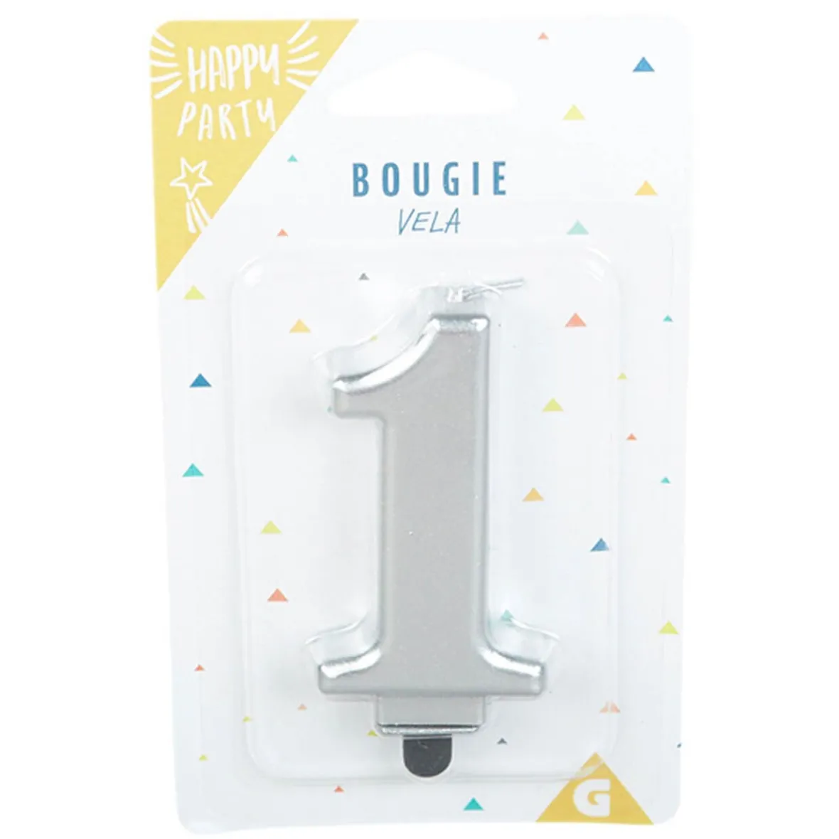Bougie d’anniversaire, chiffre un de couleur mate argentée.