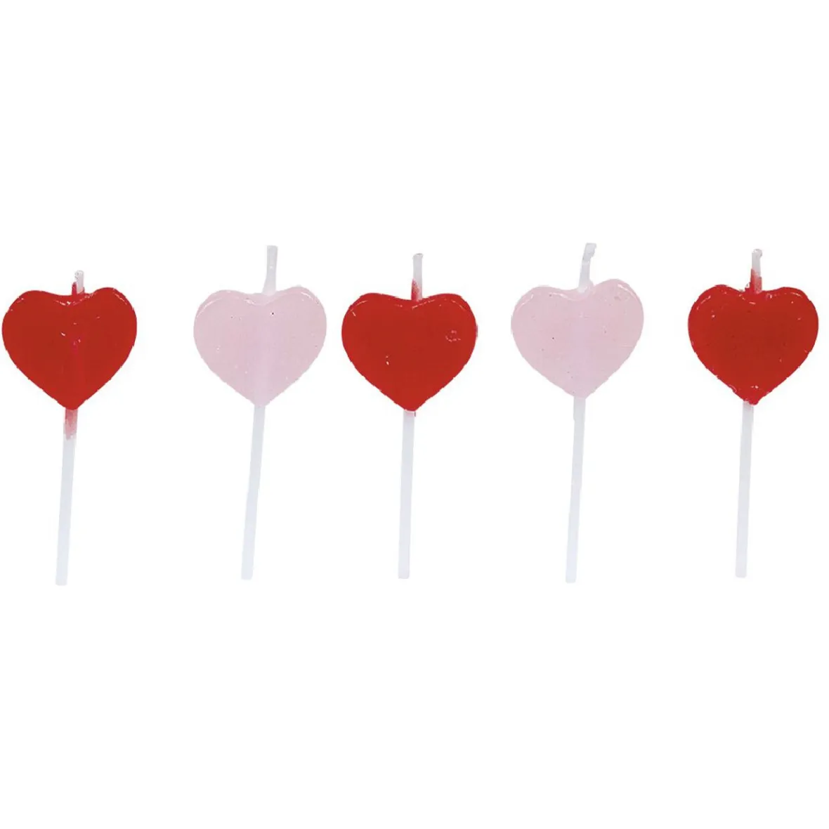 Lot de 5 bougies anniversaire en forme de coeur rose et rouge.