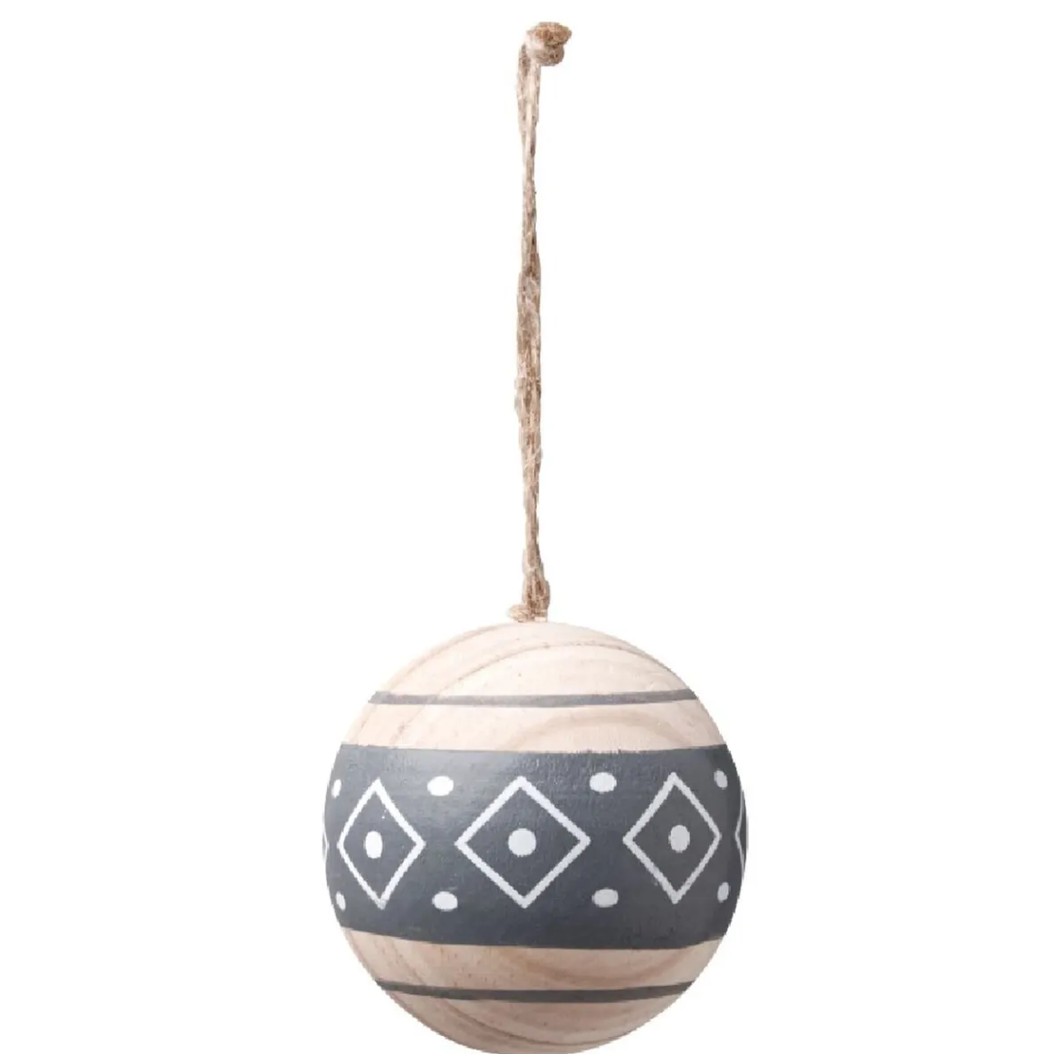 Boule de Noël en bois décoré dans l’esprit ethnique.br>Ce produit existe en 4 modèles, modèle aléatoire selon disponibilité en magasin.