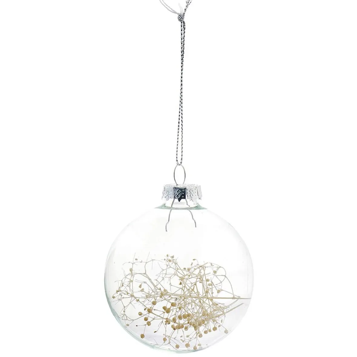 Jolie boule de Noël en verre garnie de feuilles séchées.