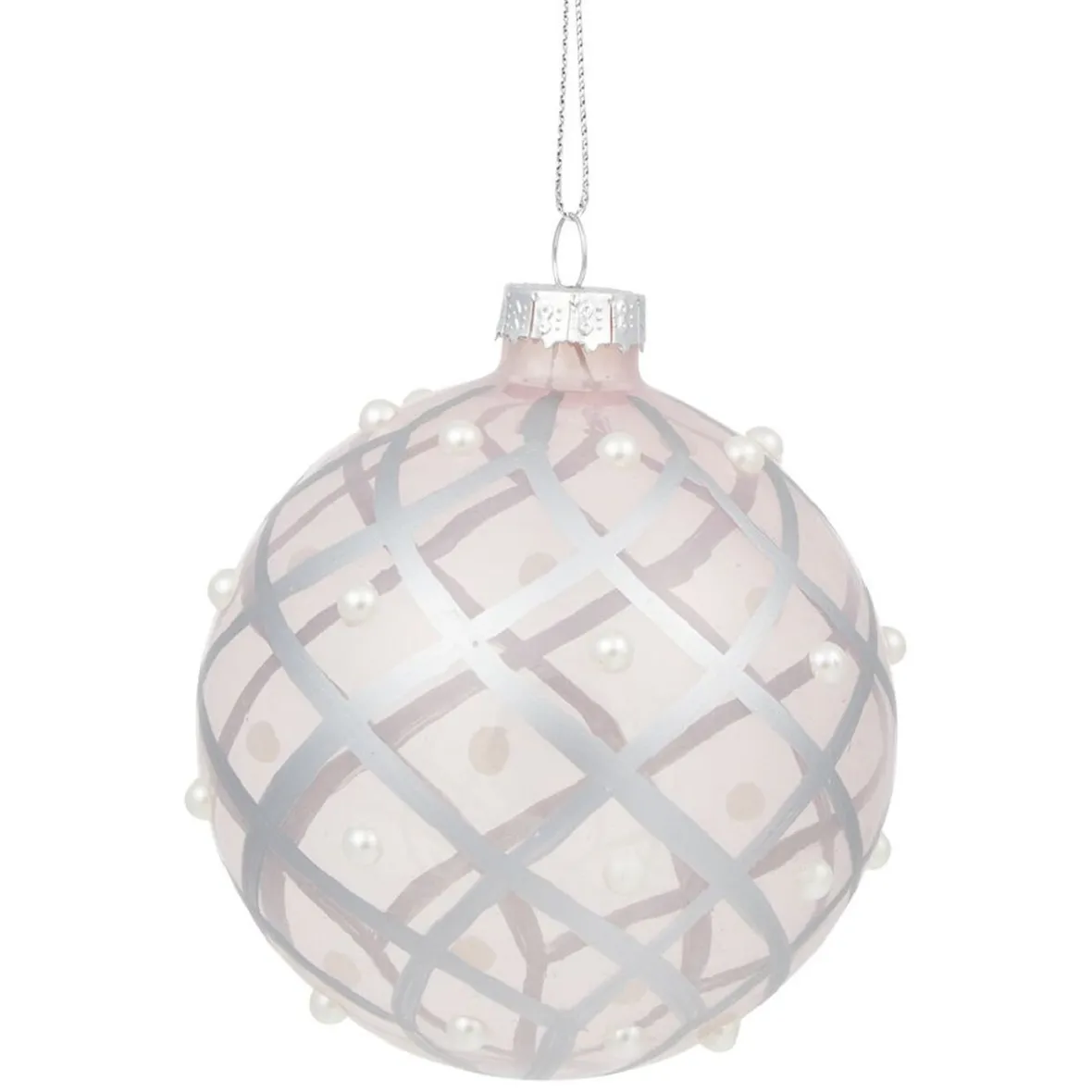 Boule de Noël transparente en verre de différentes teintes avec des dessins argentés pour un style scandinave à suspendre au sapin.