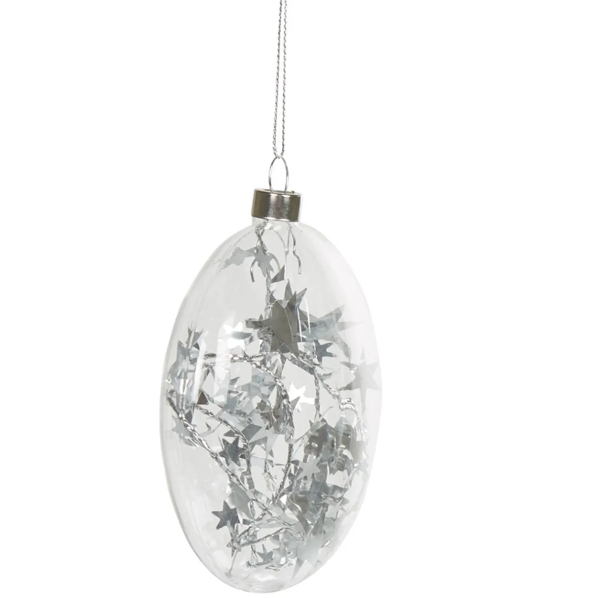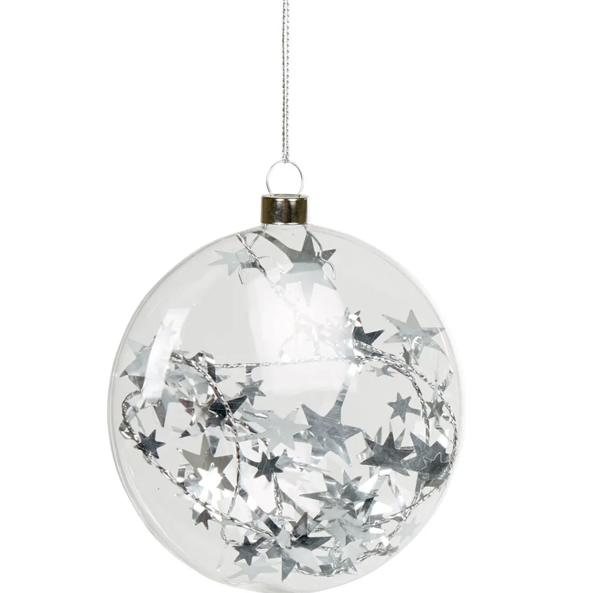 Boule de Noël plate transparente avec guirlande d’étoiles argentée à l’intérieur.
