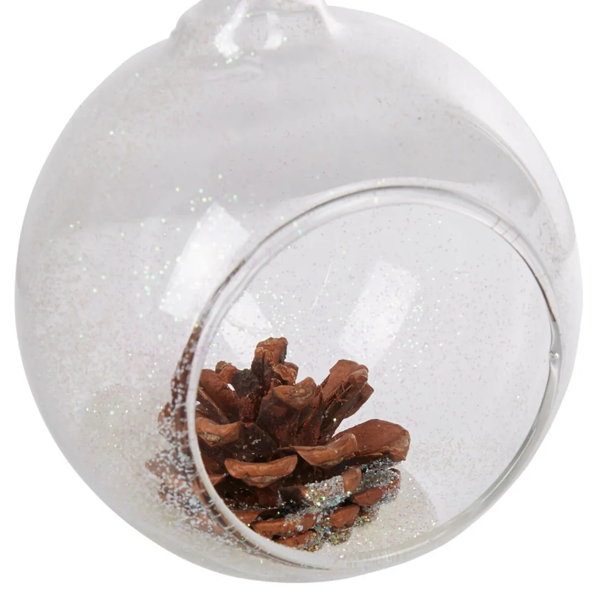 Avec une décoration de Noël givré, cette pomme de pin dans une boule de verre façon terrarium apportera un côté nature et décoratif à votre sapin.