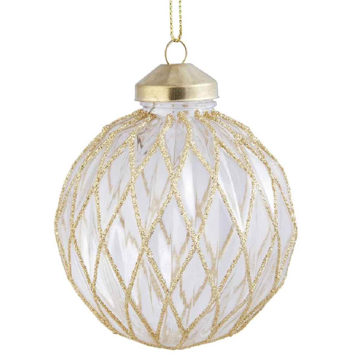 Boule de Noël transparente avec motifs dorés à paillettes à suspendre au sapin pour donner un look vintage à votre décoration.