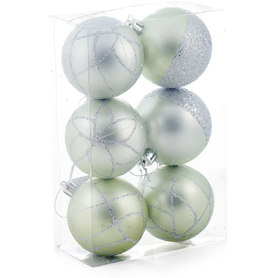 Lot de 6 boules de Noël au design original pailleté de couleur verte et argentée.