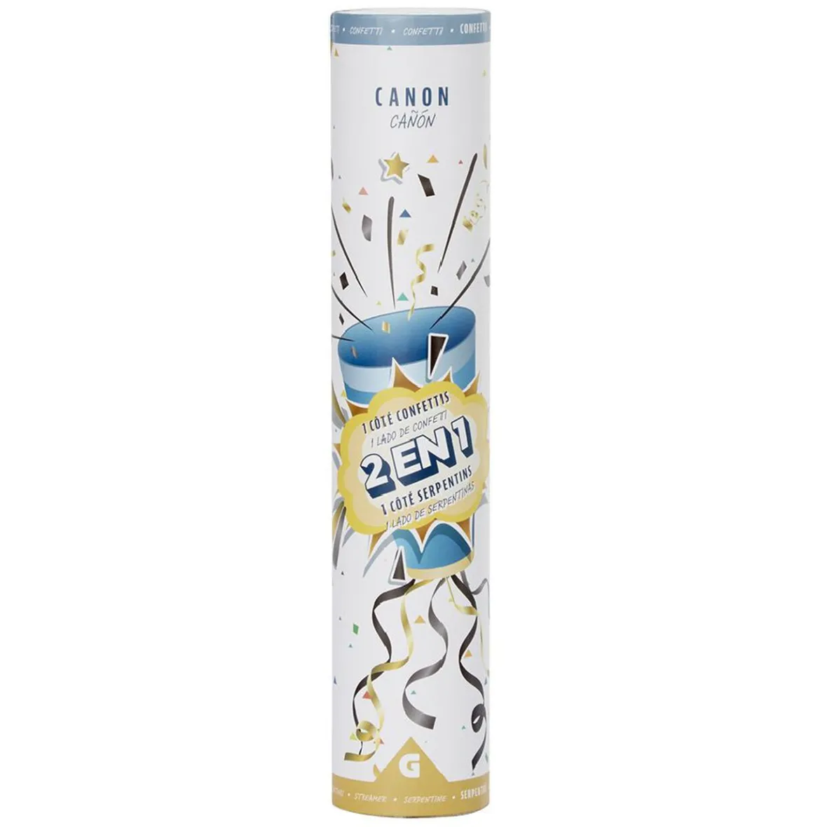 Canon double avec un côté confettis et l’autre serpentins pour une explosion tricolore noire, dorée et blanche.