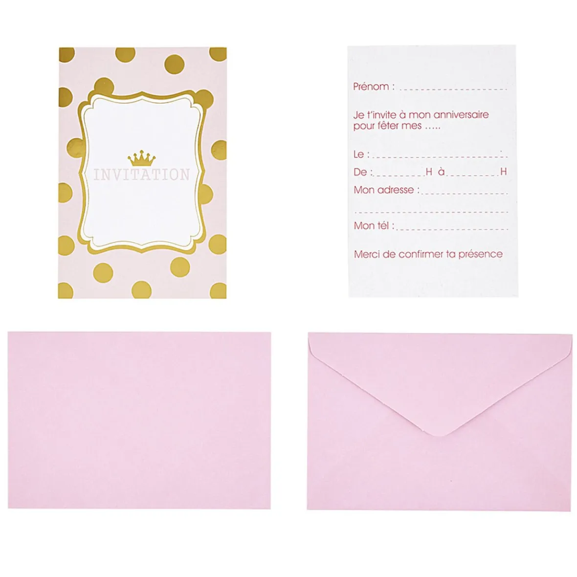 Avez-vous pensé à tout pour l’anniversaire de votre bambin ? N’oubliez pas ses copains et invitez-les avec ce lot de 8 jolies cartes d’invitation rose et doré à poids accompagnées de leurs enveloppes roses.
