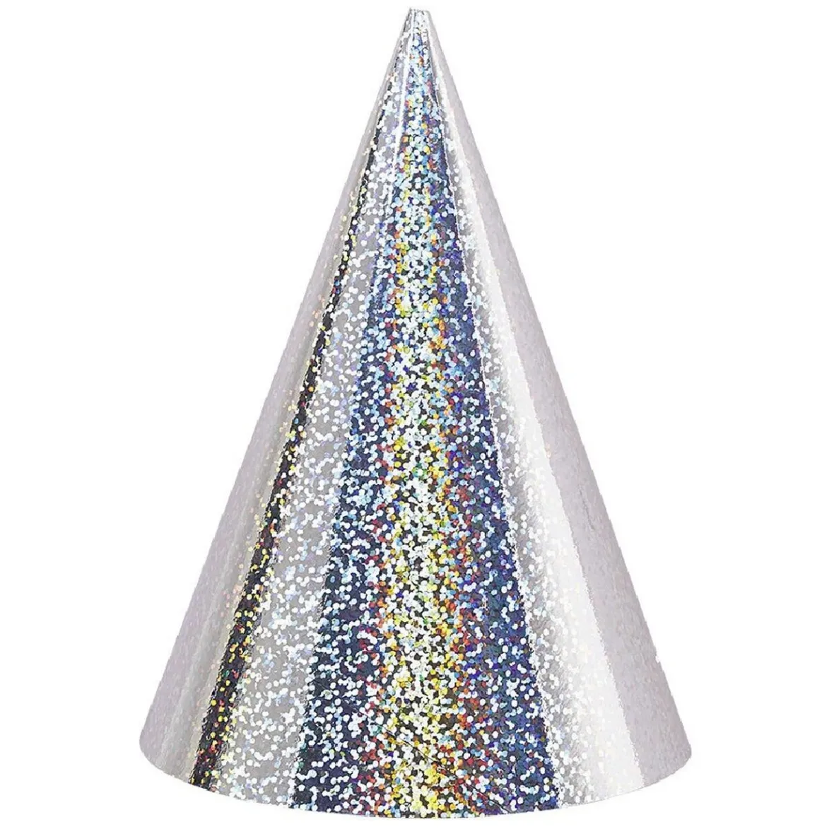 Lot de 6 chapeaux de fête dorés et argentés holographiques.
