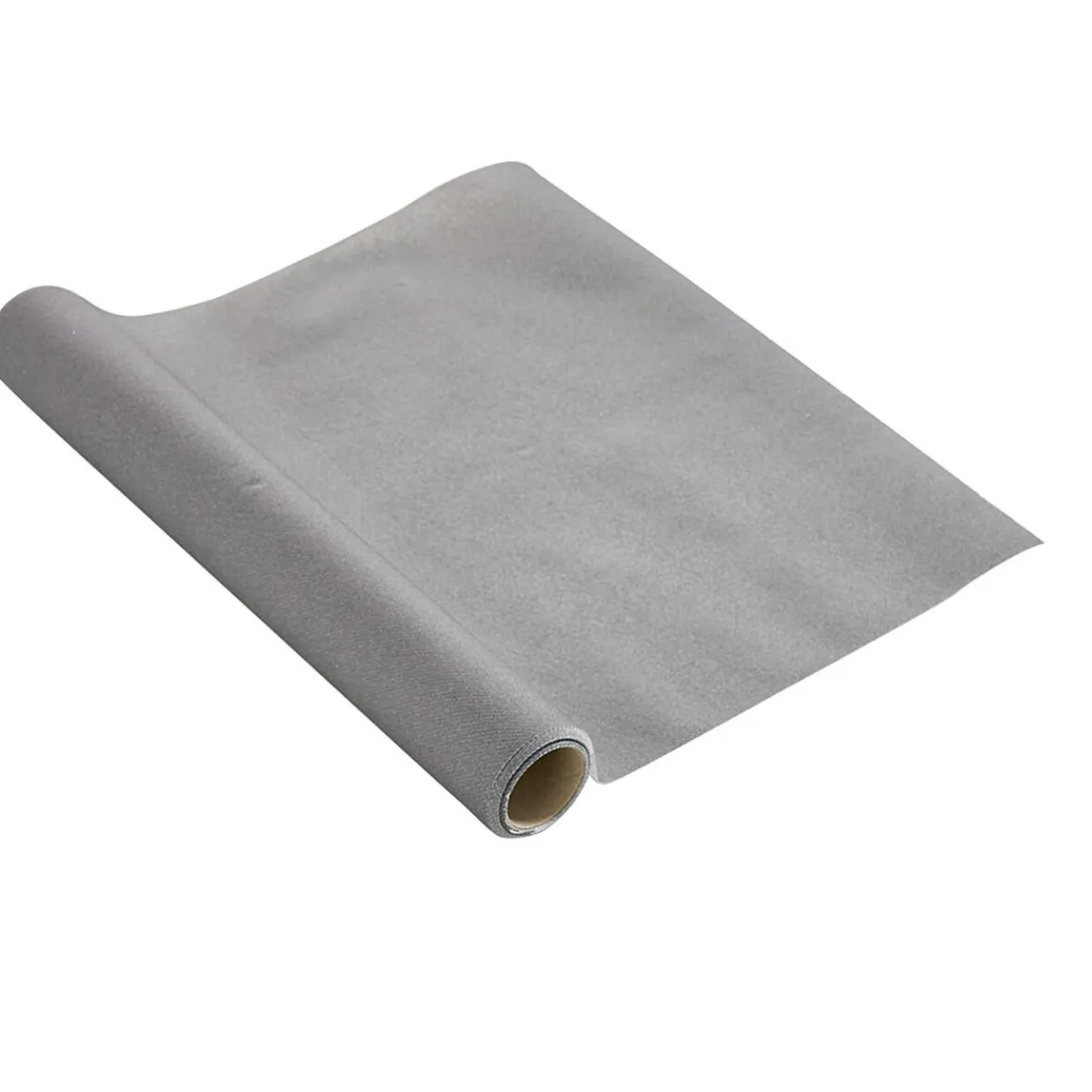 Associez votre nappe à ce chemin de table effet tissu gris foncé en papier voie sèche, et vous obtiendrez un rendu chic et sobre à la fois.