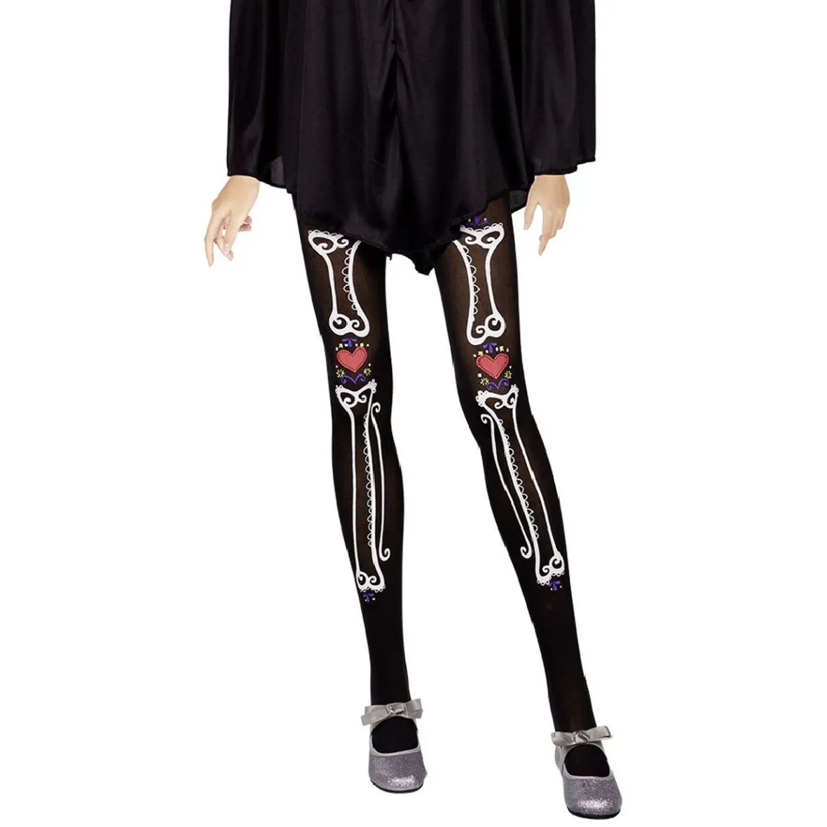 Paire de collants imprimé squelette noir et blanc façon calavera pour adulte.