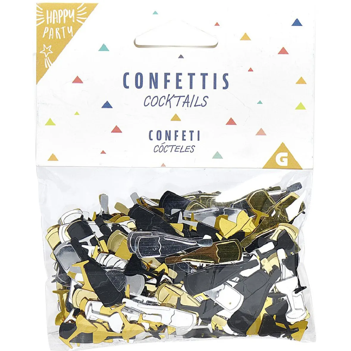 Sachet de confettis multicolores en forme de bouteille et de coupe à champagne.