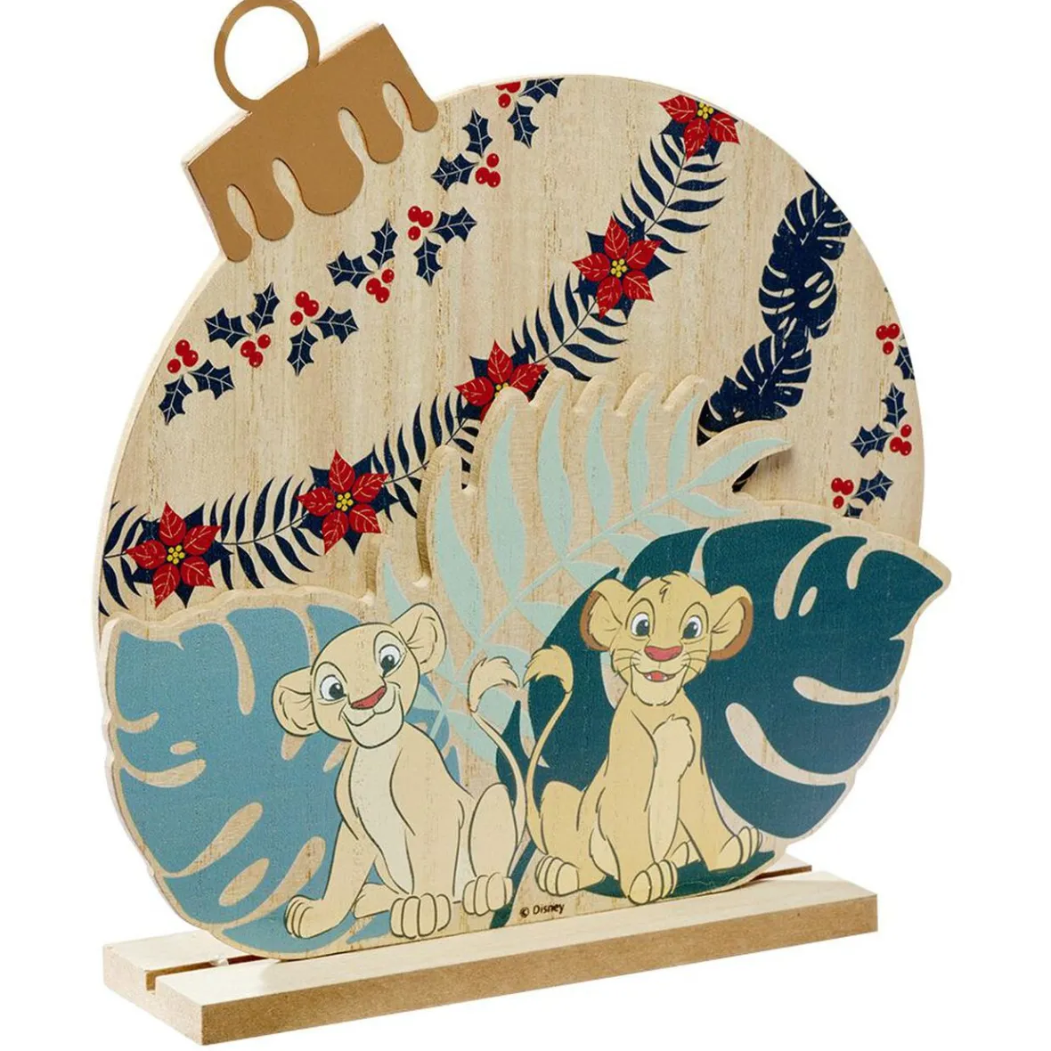 Décoration à poser en forme de boule de Noël plate en bois agrémentée de motifs feuillages, fleurs, houx avec imprimé Nala et Simba du Roi Lion.