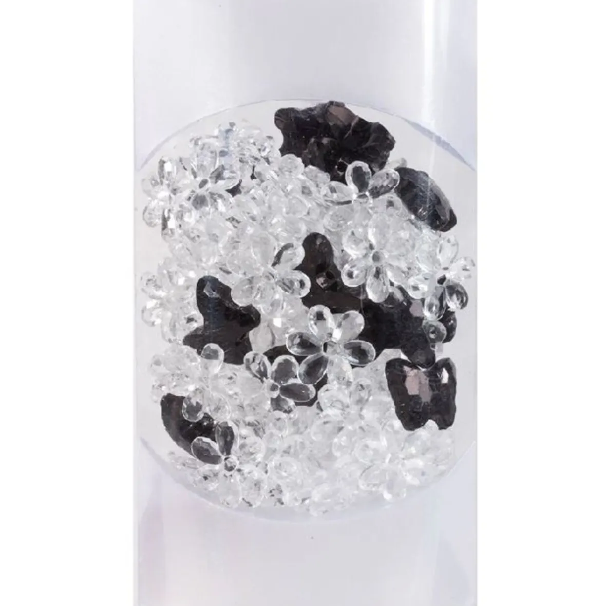 Fleurs transparentes et papillons noirs en plastique pour décoration. Poids net de 100 gr.