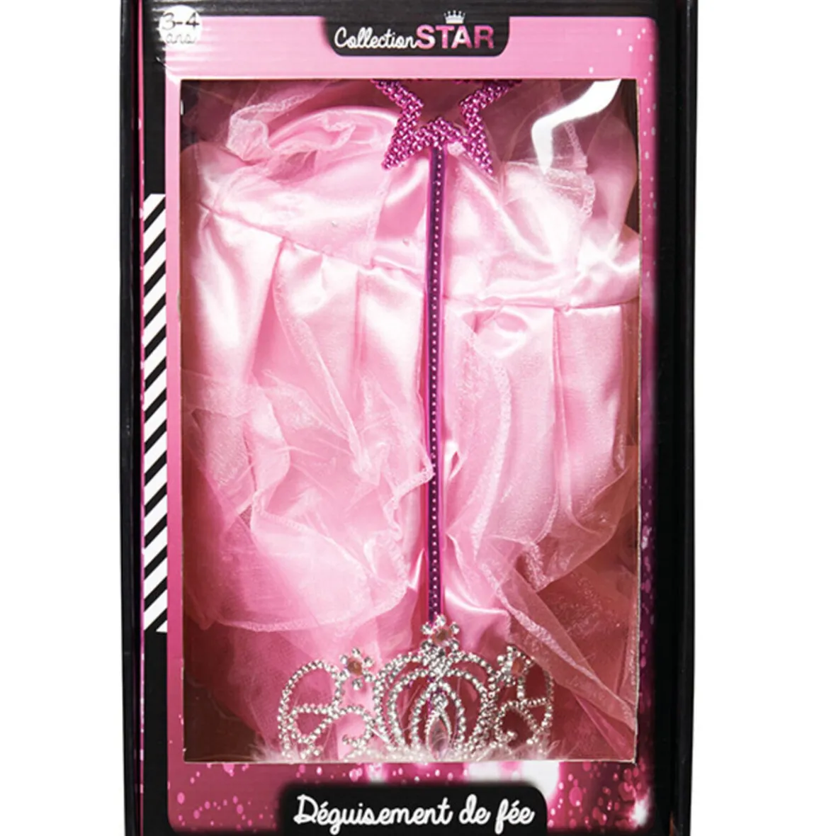 Déguisement de fée comprenant 1 robe en polyester, 1 baguette et 1 diadème en plastique. Taille 3/4 ans.