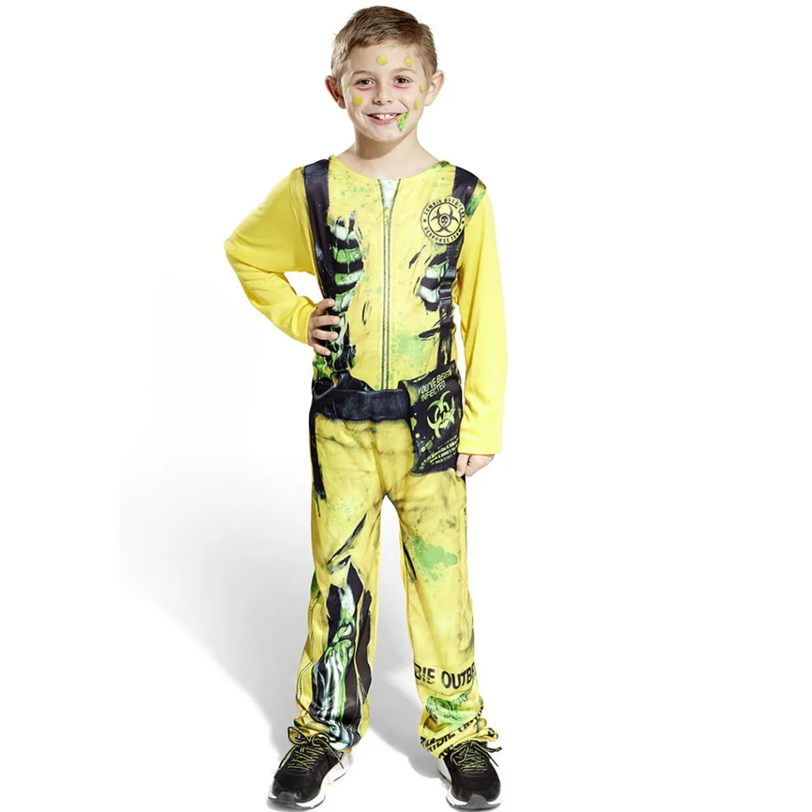 Faites partie de ces chercheurs touchés en premier lieux par l’infection zombie avec ce déguisement jaune et noir. Contient une combinaison entière phosphorescente pour enfant de 7/10 ans.