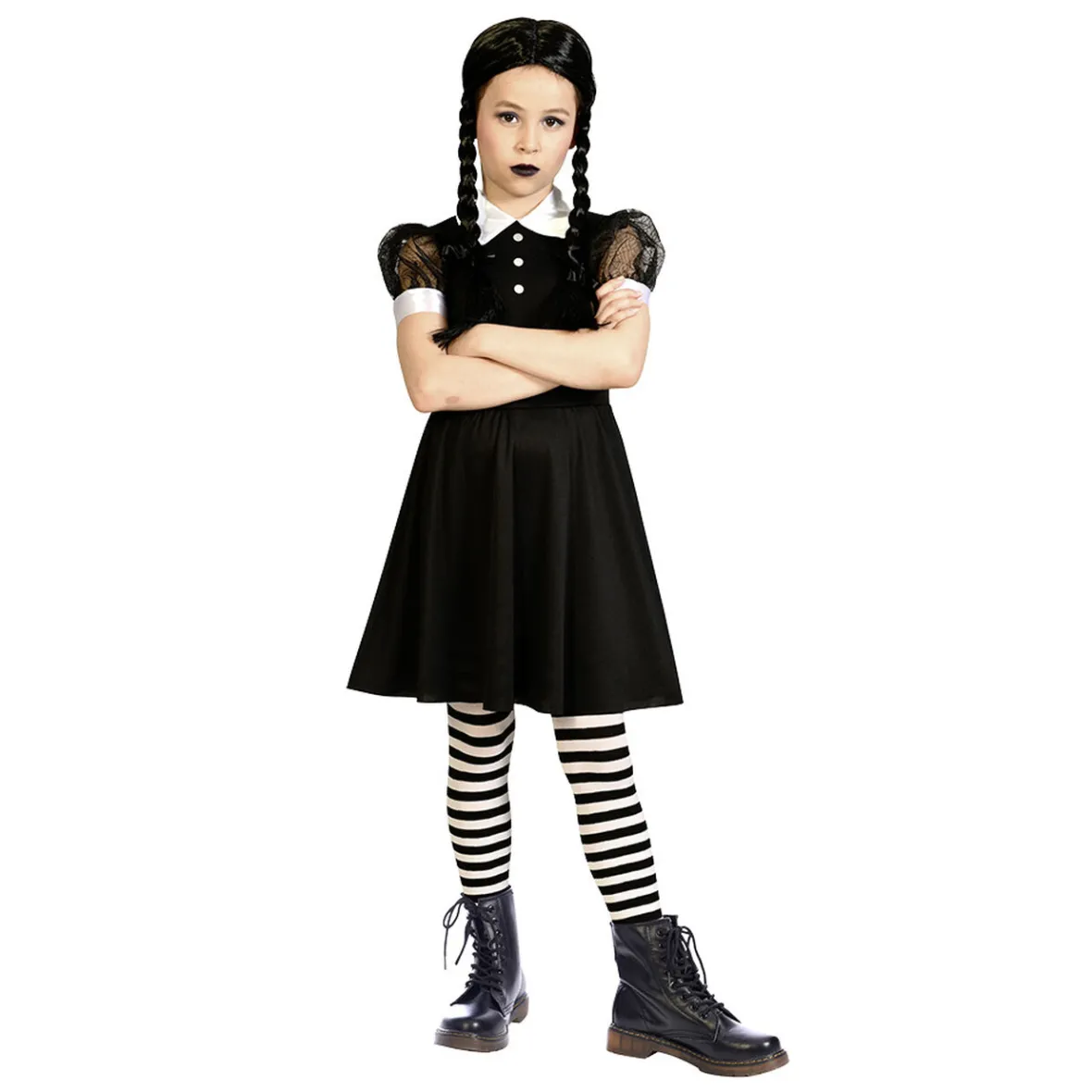 Cette petite robe noire avec col blanc sera parfaite pour imiter la tenue de Mercredi dans la famille Adams. Idéal pour se déguiser à l’occasion de Halloween ou autre fête dans le thème gothique.