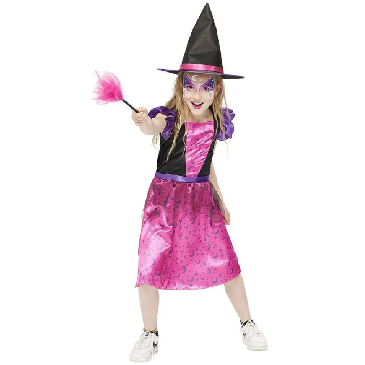 Un déguisement de sorcière pour fille de 7/10 ans. Comporte un chapeau, une robe et une baguette magique.