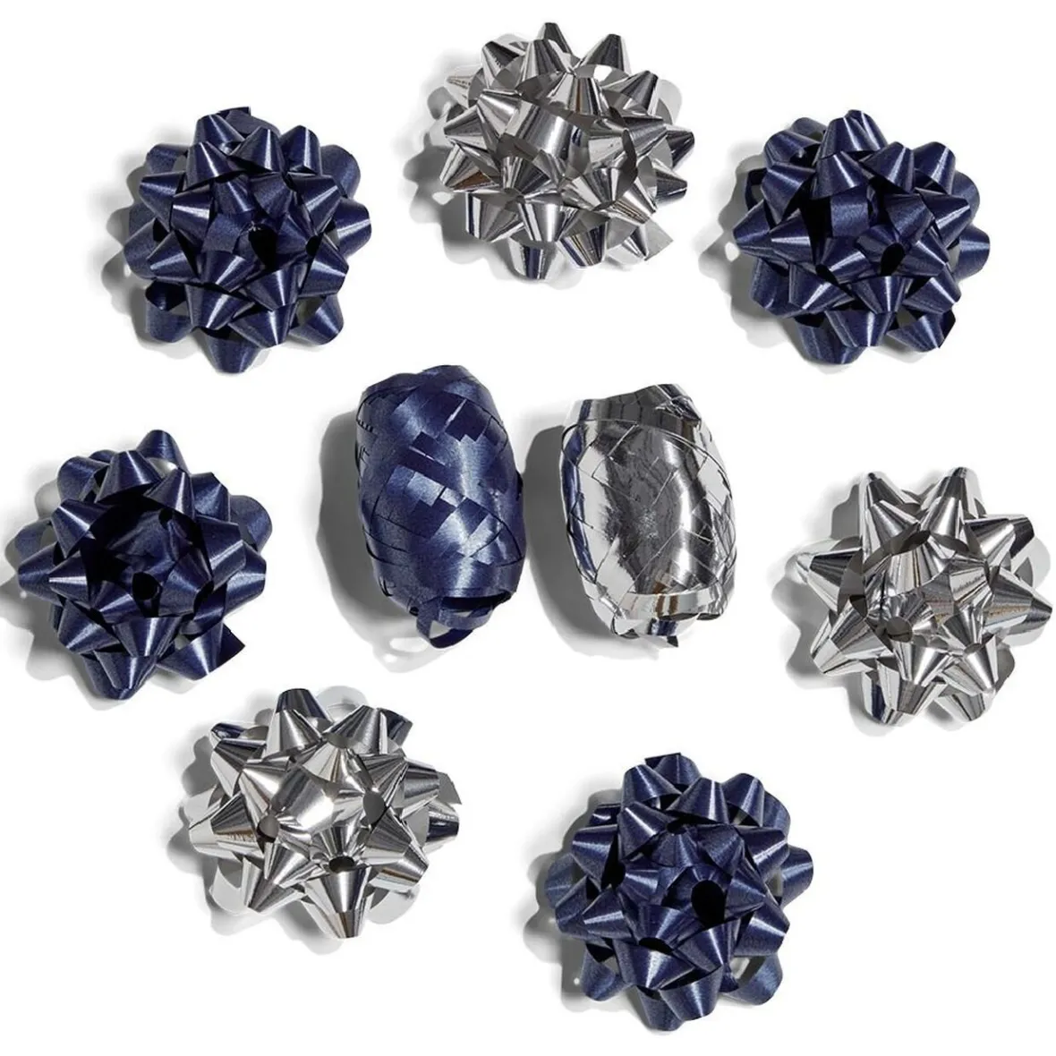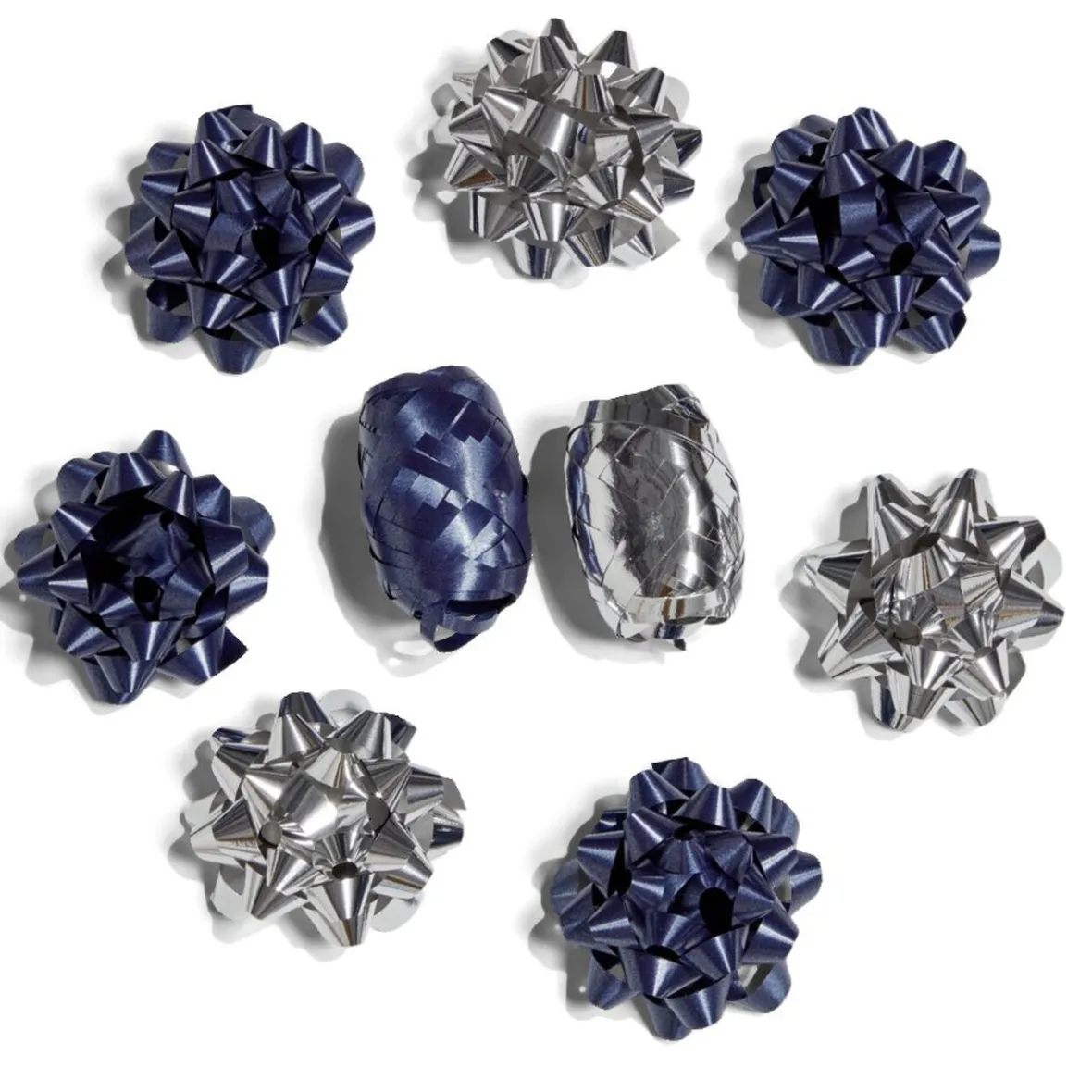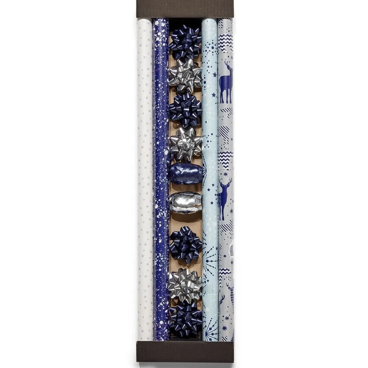 Comprend 4 rouleaux de papier cadeau assortis, 3 noeuds bleu argenté, 4 noeuds bleus et 2 rouleaux de ruban brillant dont 1 bleu argenté et 1 bleu.