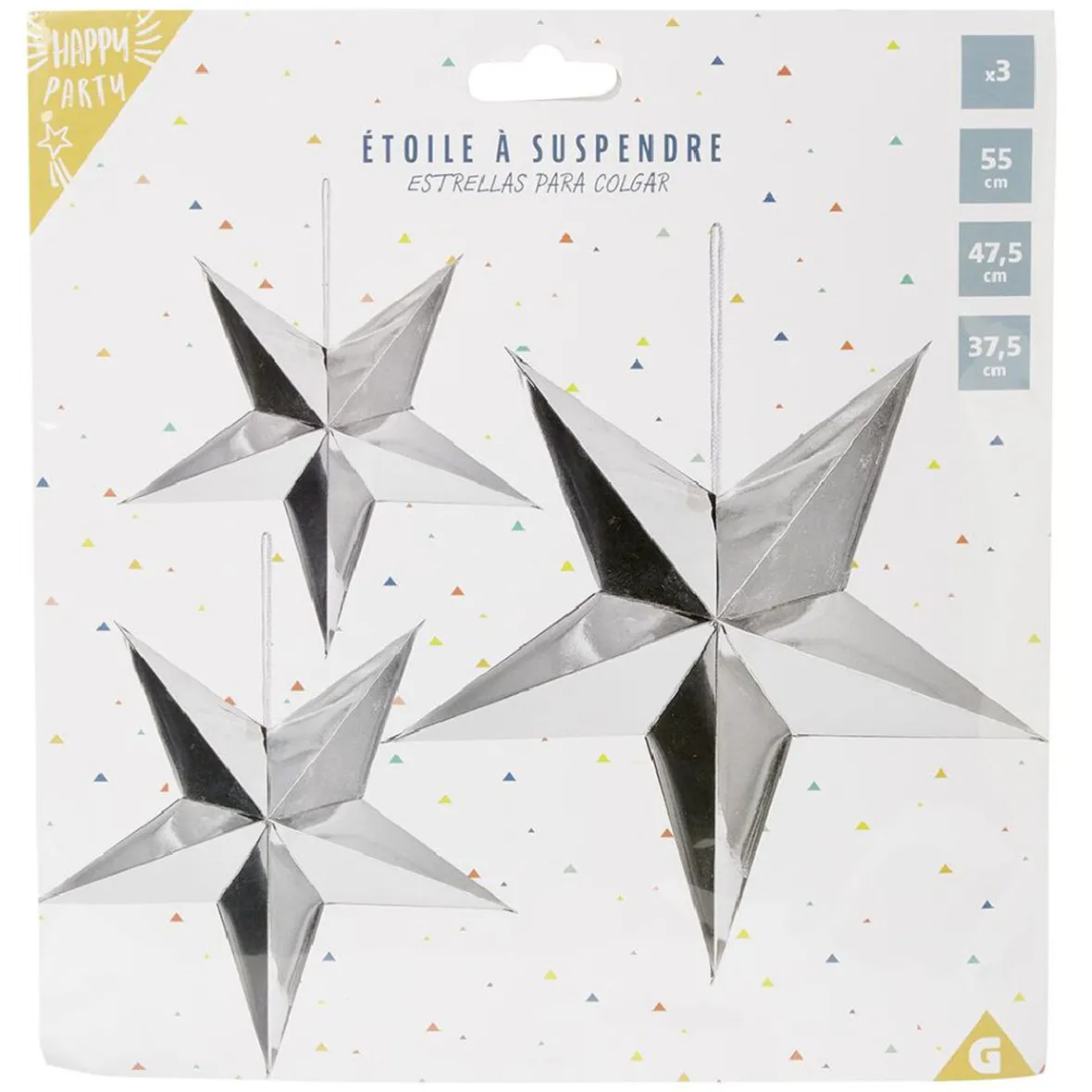 Lot de 3 suspensions en forme d’étoile en papier argenté, chacune de taille différente.