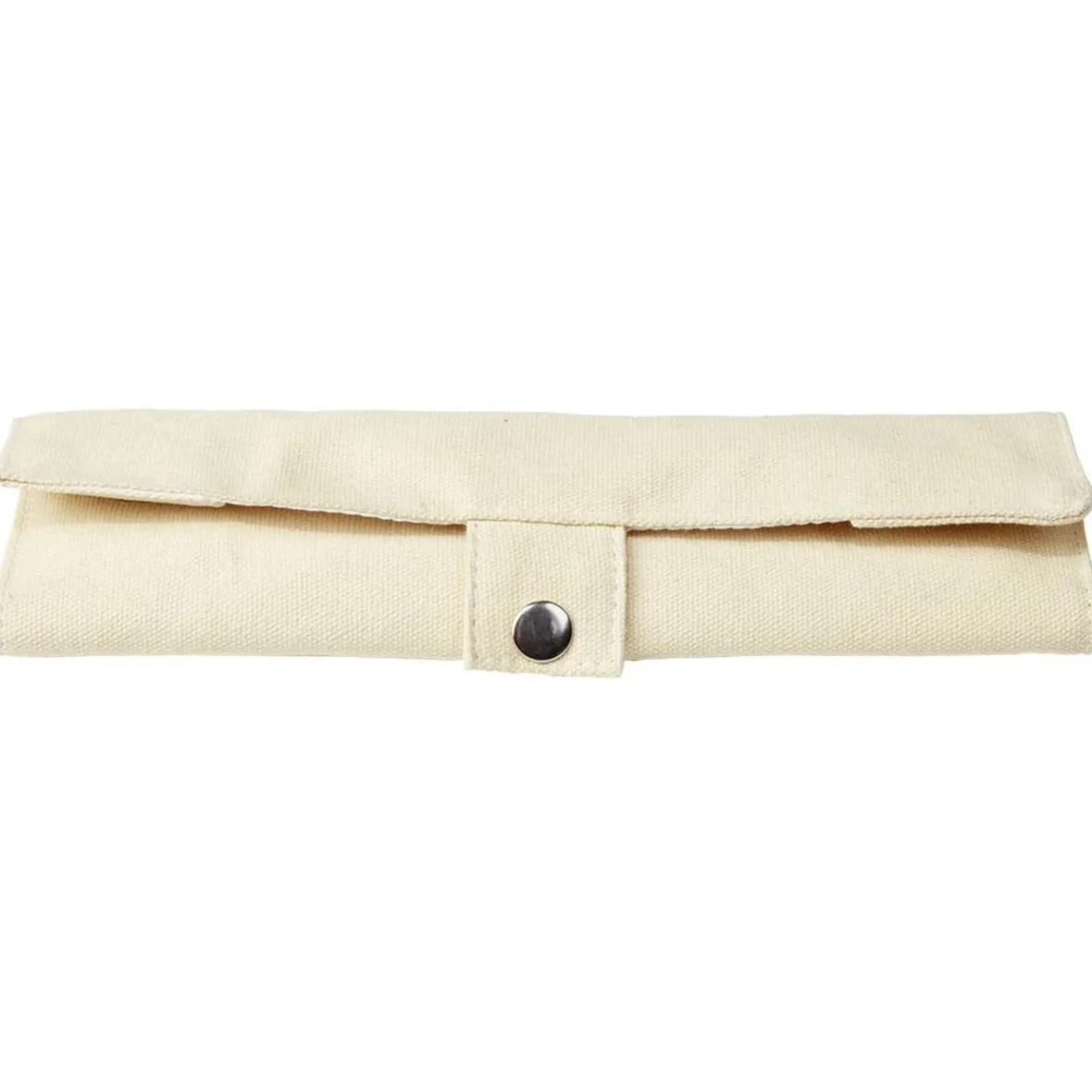 Kit de couverts réutilisables en bambou, facile à emporter grâce à son étui de transport en tissu beige.