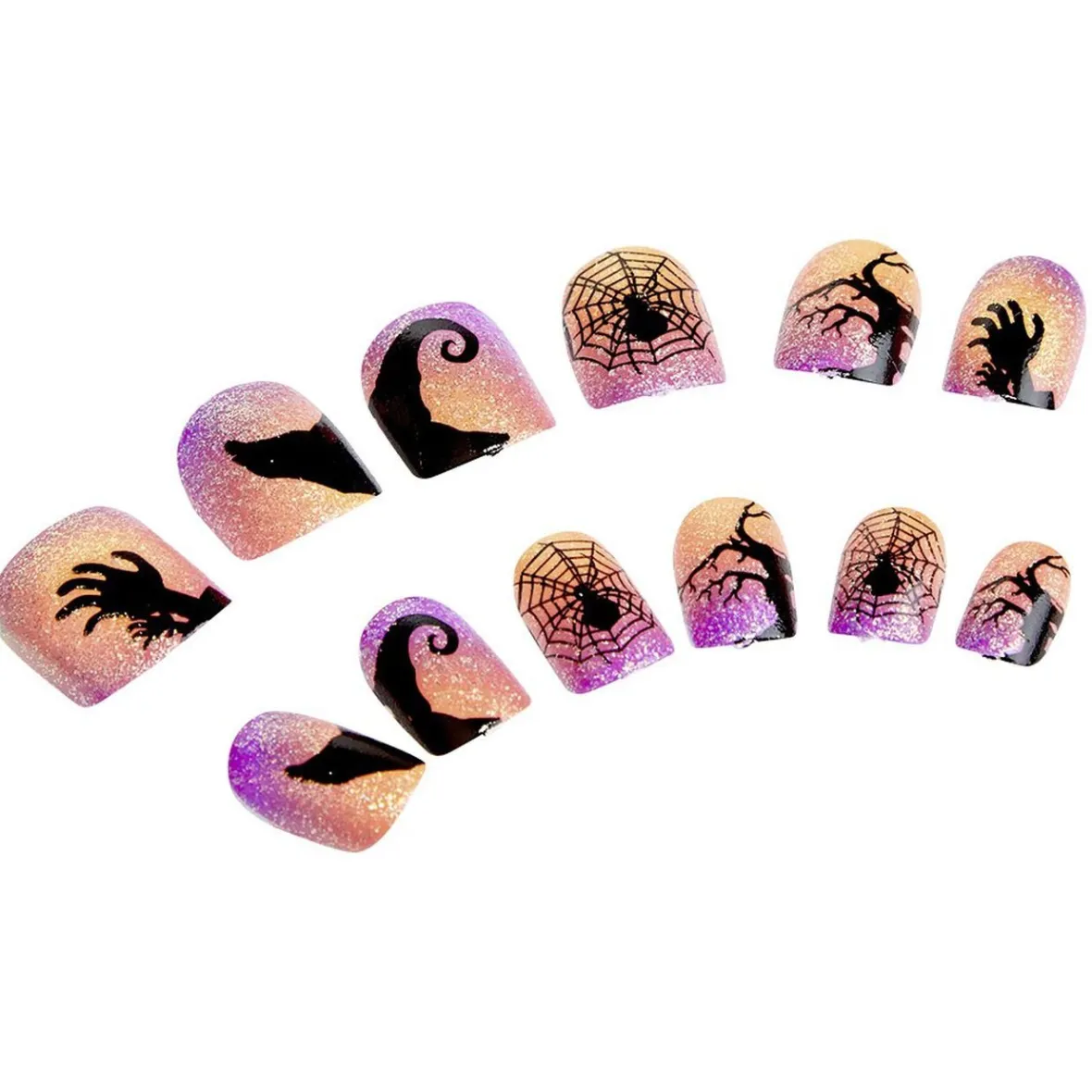 Lot de 12 faux ongles roses et orangés avec motifs d’Halloween noirs.