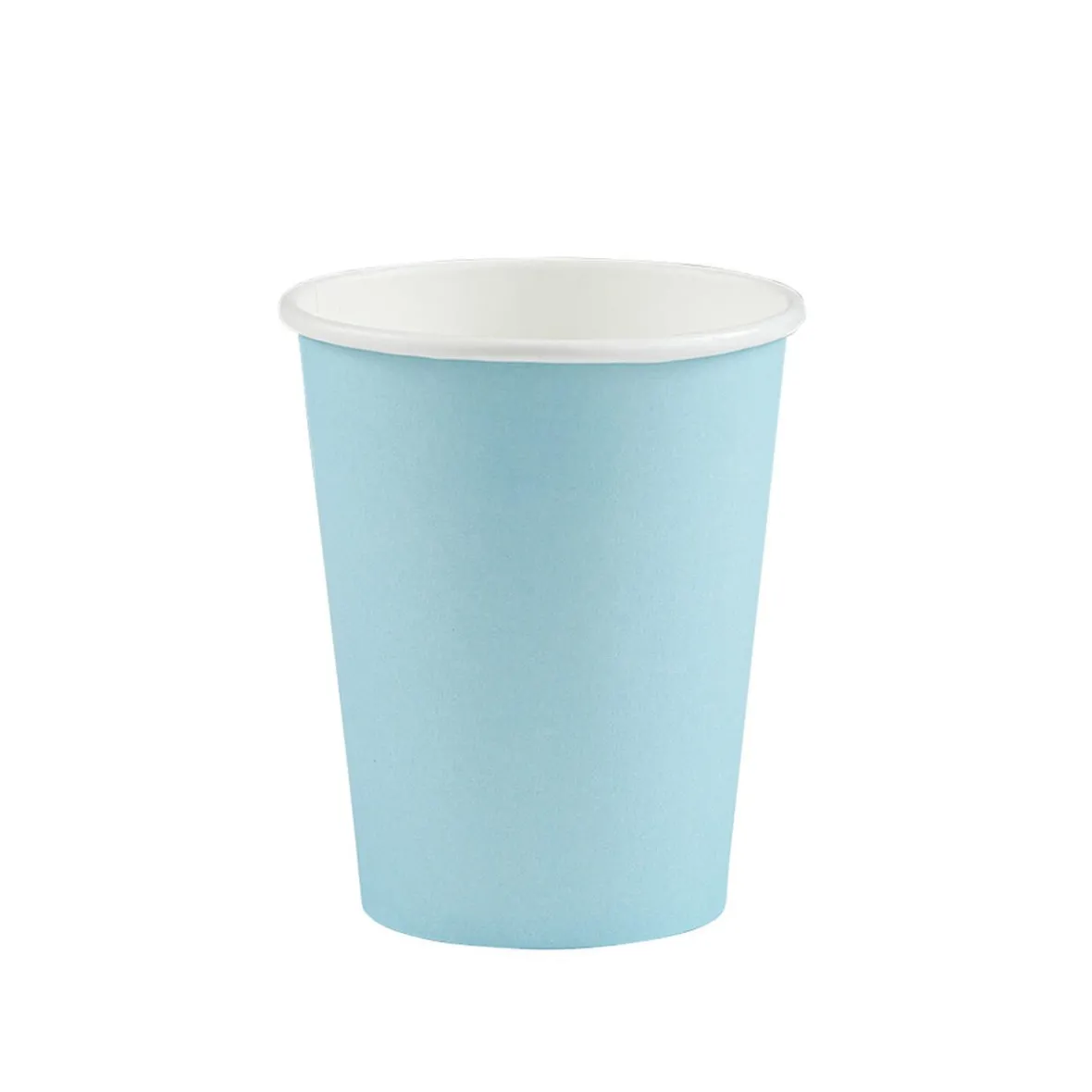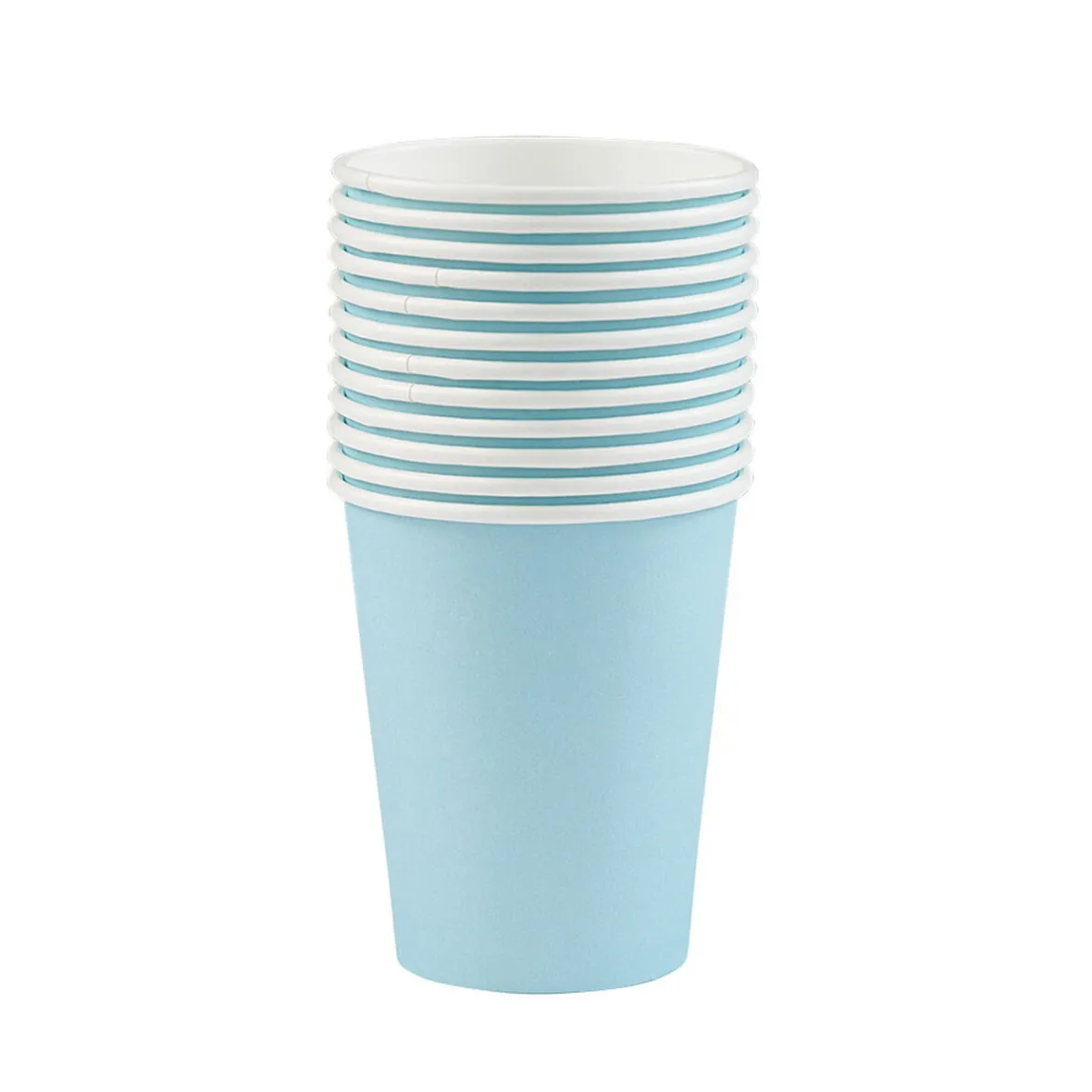 Ce lot de 12 gobelets en carton couleur bleu clair et blanc sera idéal pour servir à boire à vos invités.