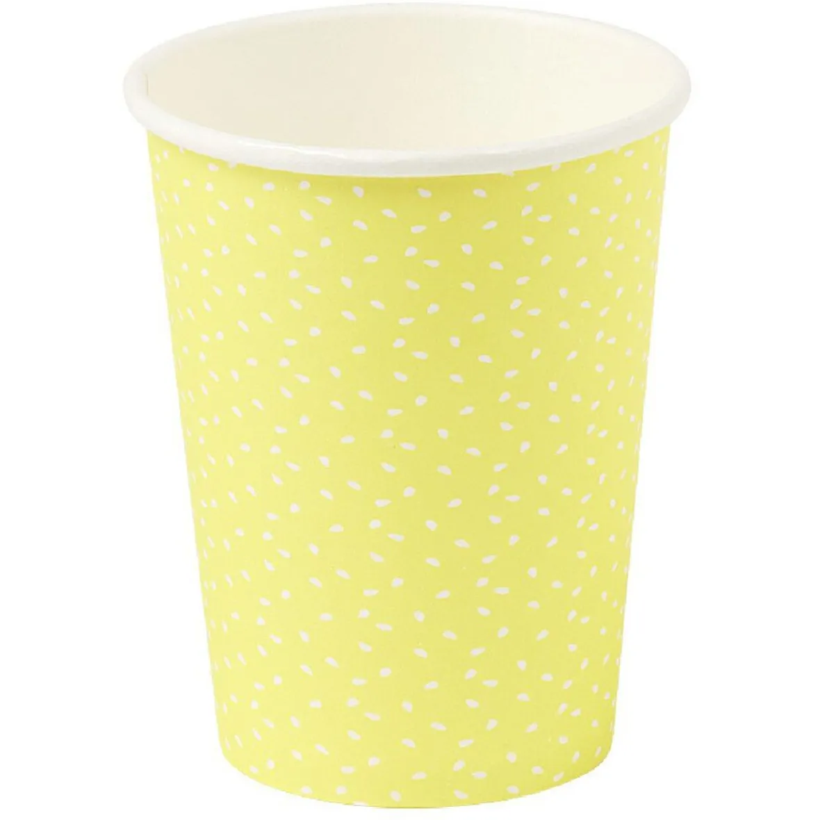 Lot de 10 gobelets en carton jaune au motif confettis blanc d’une contenance de 25 cl.