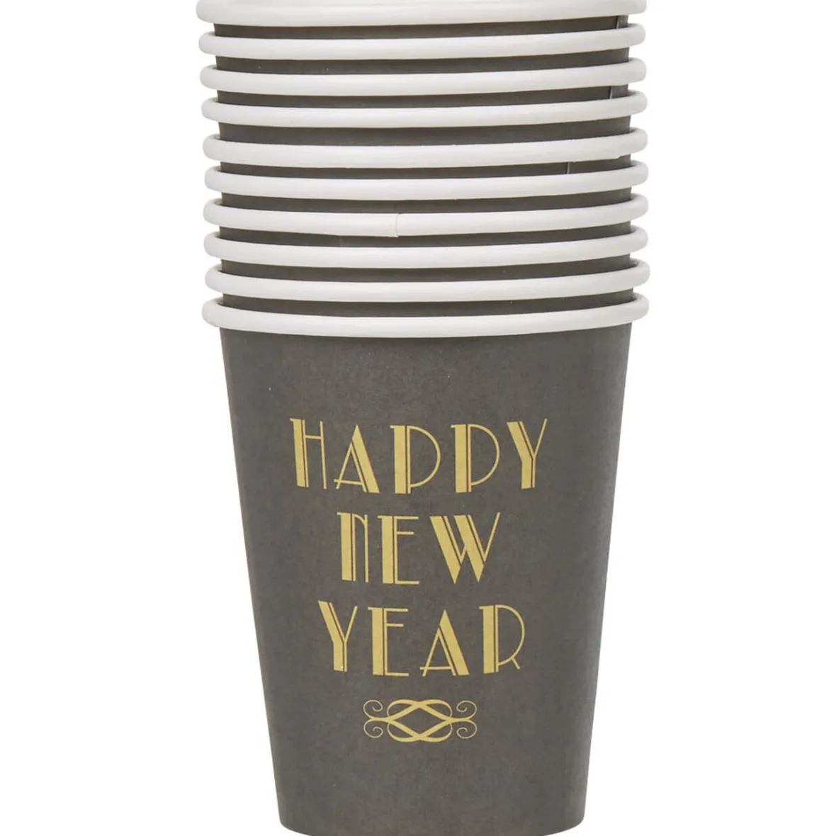 Lot de 10 gobelets jetables noirs et or design Happy New year, pour donner un style chic et festif à votre table de fêtes.