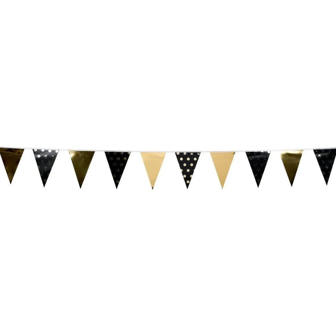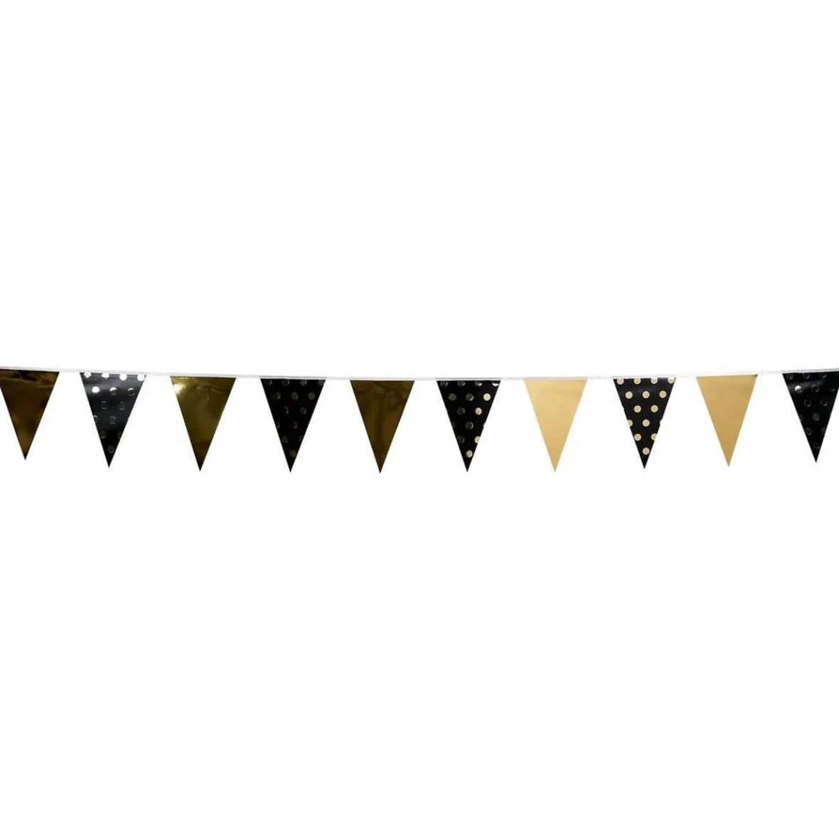Les fanions scintillants unis dorés ajoutent une note chic et glamour, tandis que les fanions noirs à pois dorés apportent une touche de charme festif.