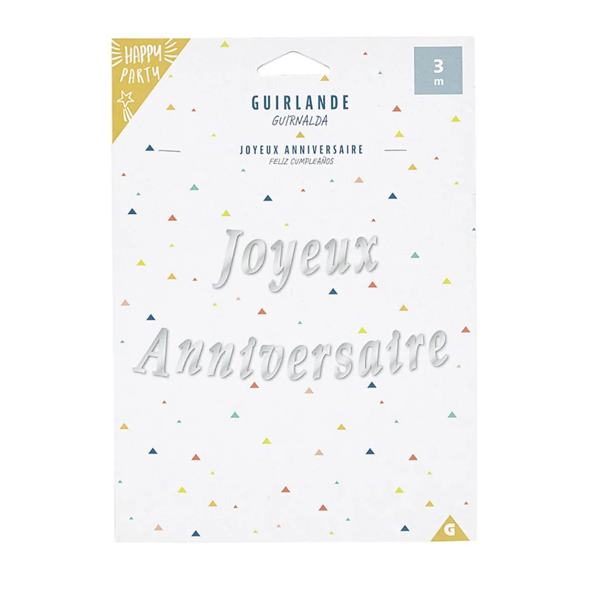 Pour fêter un anniversaire en beauté, n’oubliez pas d’accrocher la guirlande « Joyeux anniversaire » de couleur argenté.
