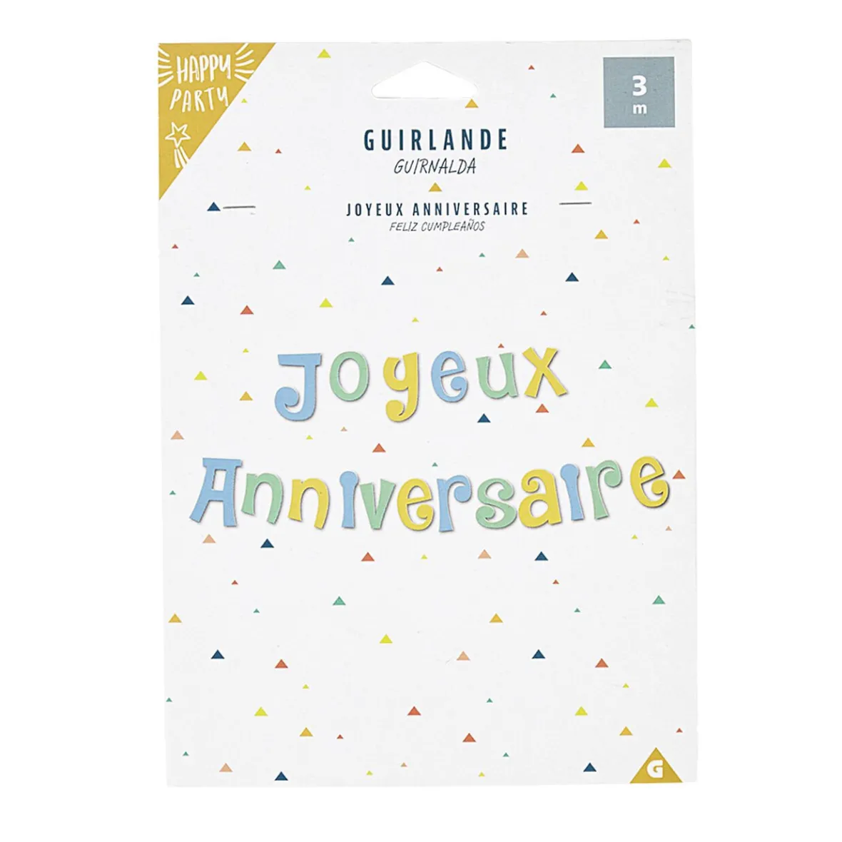 Pour fêter un anniversaire en beauté, n’oubliez pas d’accrocher la guirlande « Joyeux anniversaire » de couleur bleu, vert et jaune.
