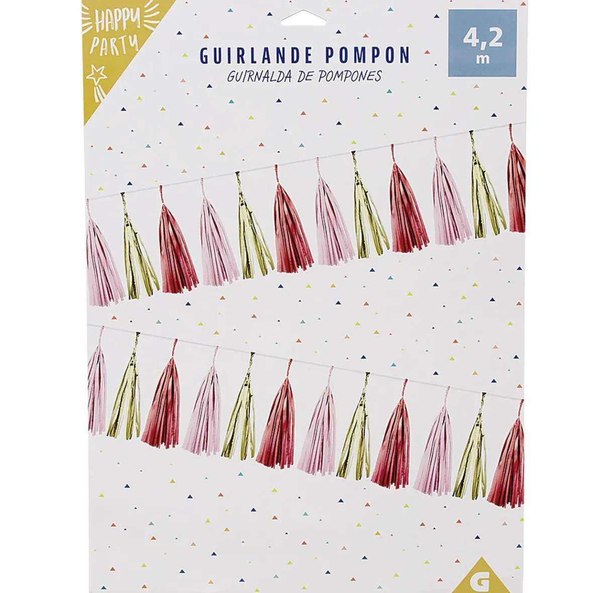 Vou s êtes en panne d’inspiration pour la décoration de votre soirée ? Nous vous proposons cette mignone guirlande à pompons de couleur rose et jaune.
