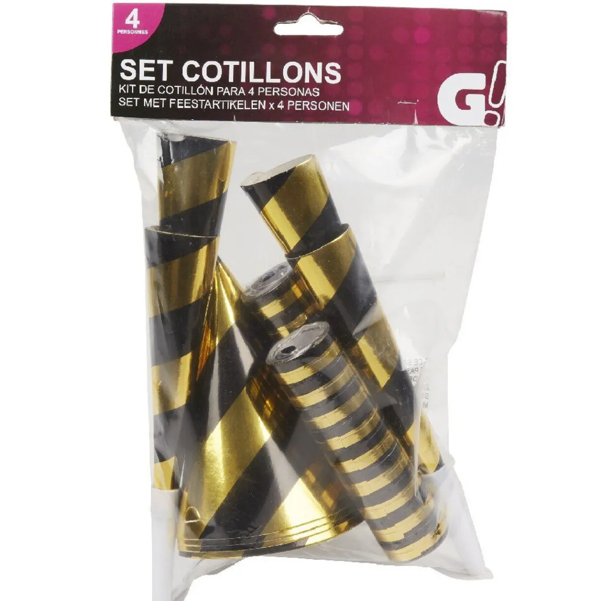 Assortimentde cotillons pour 4 personnes. Coloris noir/doré. Idéal pour célèbrer le nouvel an ou tout autre évènement en famille, entre amis!