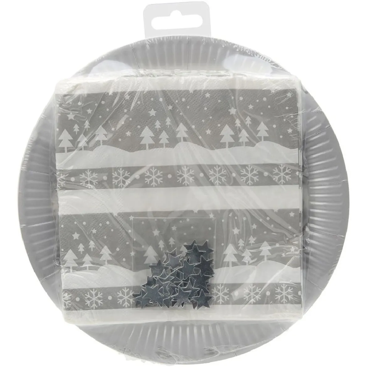 Lot de 10 assiettes en carton gris argenté avec 20 serviettes à motifs sapins de Noël et confettis de tables papier assortis. Le kit complet pour une décoration de table réussie!