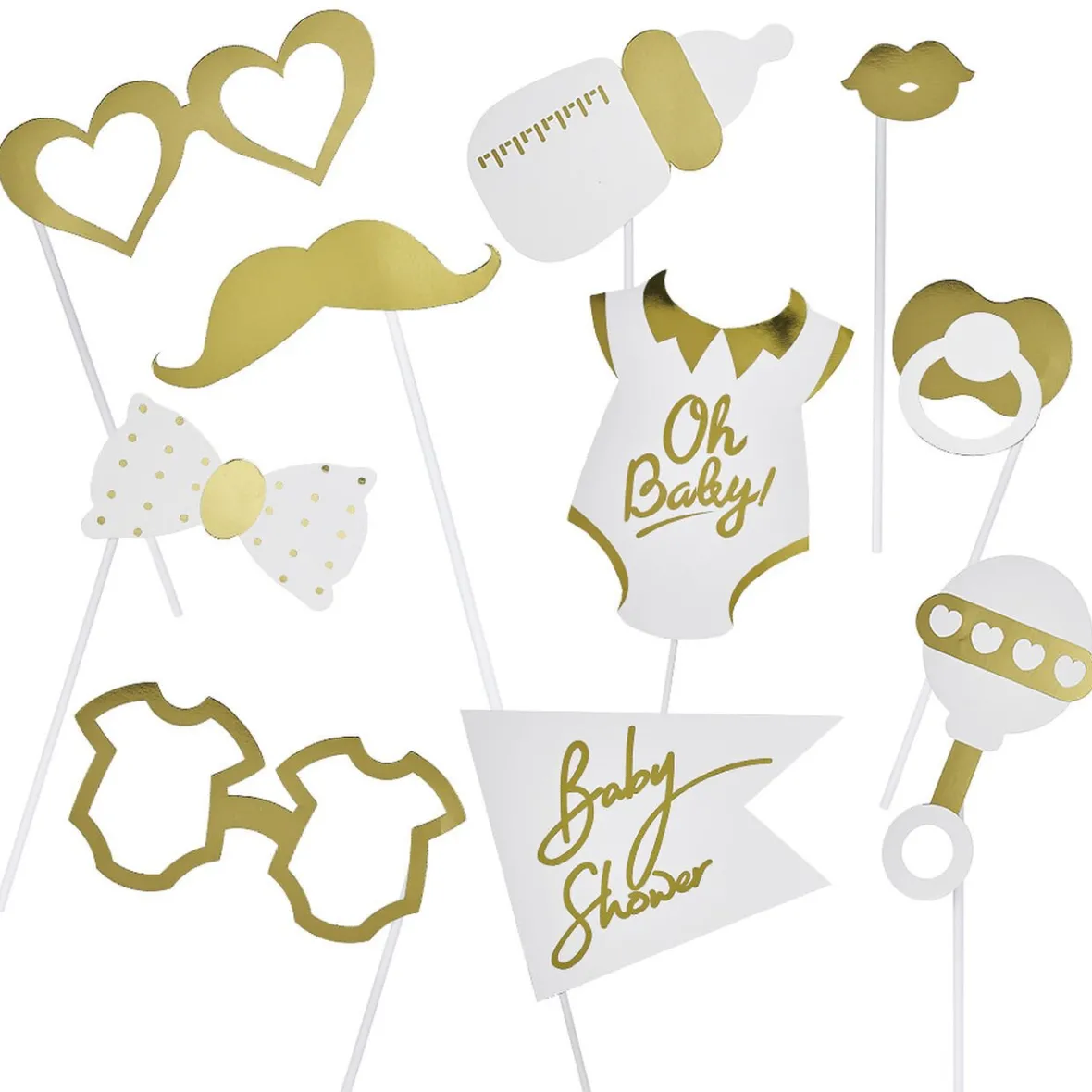 Lot de 10 accessoires photobooth pour baby shower tout en doré, idéal pour fêter la bienvenue au roi des bébés !