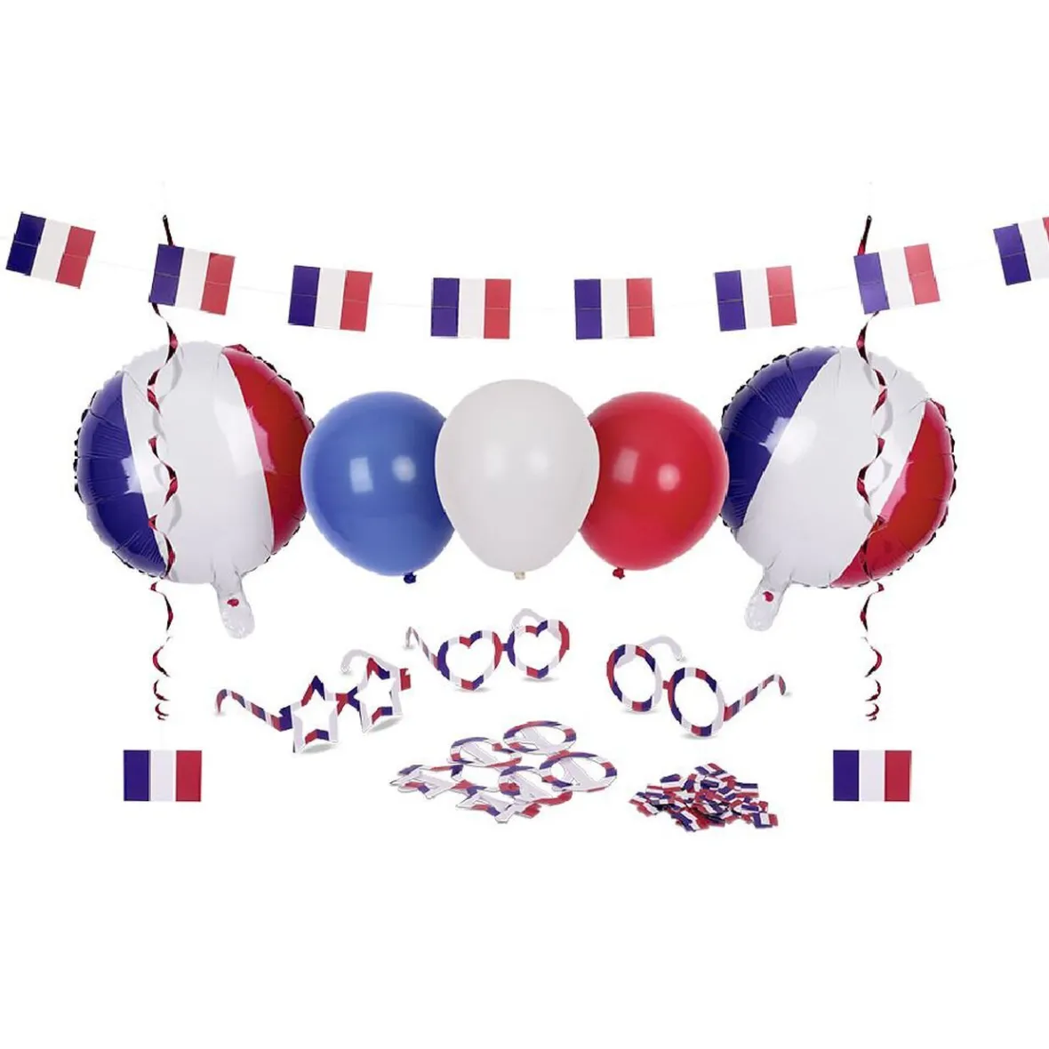 Il contient tout le nécessaire pour une décoration réussie et des célébrations de folie : ballons de baudruche, guirlandes, lunettes tricolores, confettis…