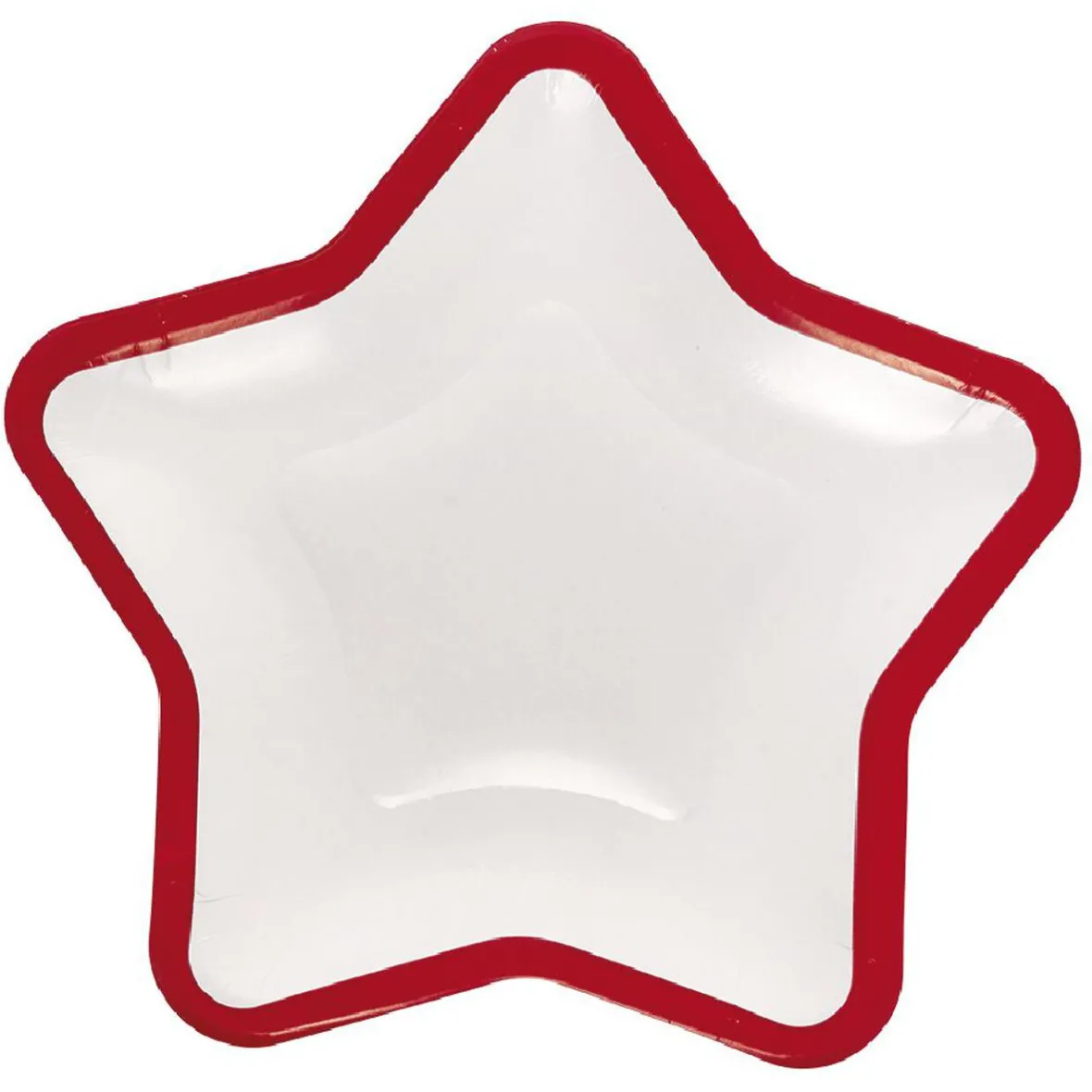 Lot de 10 assiettes en forme d’étoile blanche avec liseré rouge.
