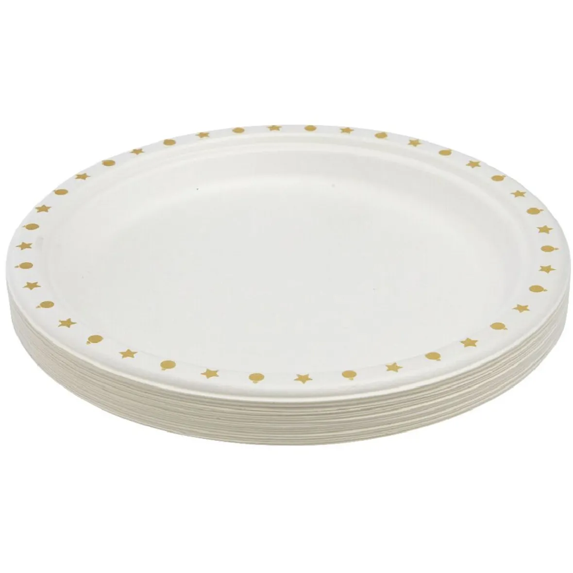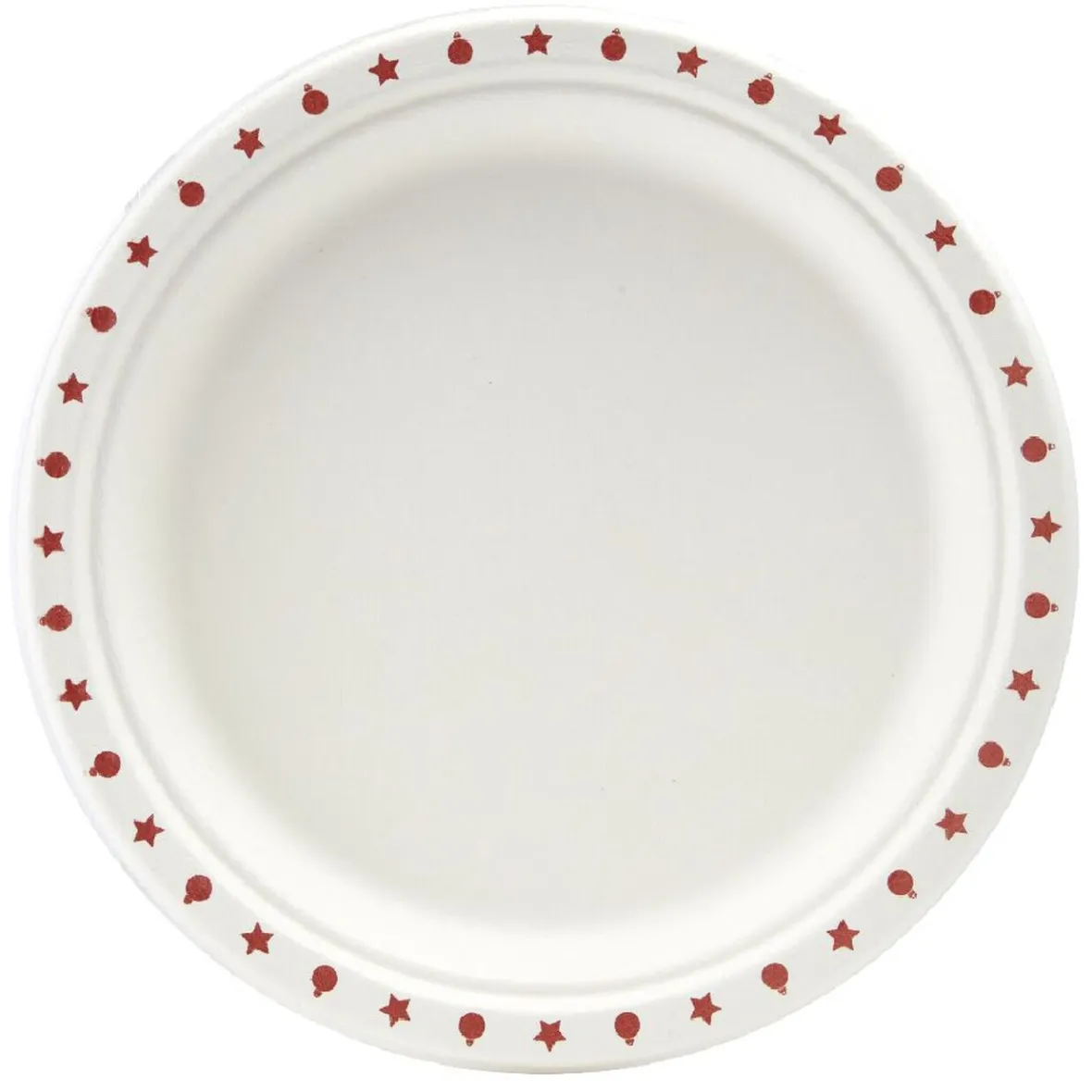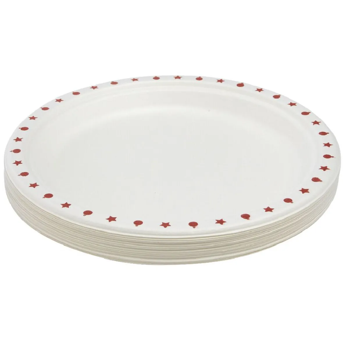 Lot de 20 assiettes blanches en canne à sucre, avec bord imprimé étoiles et boules de Noël.