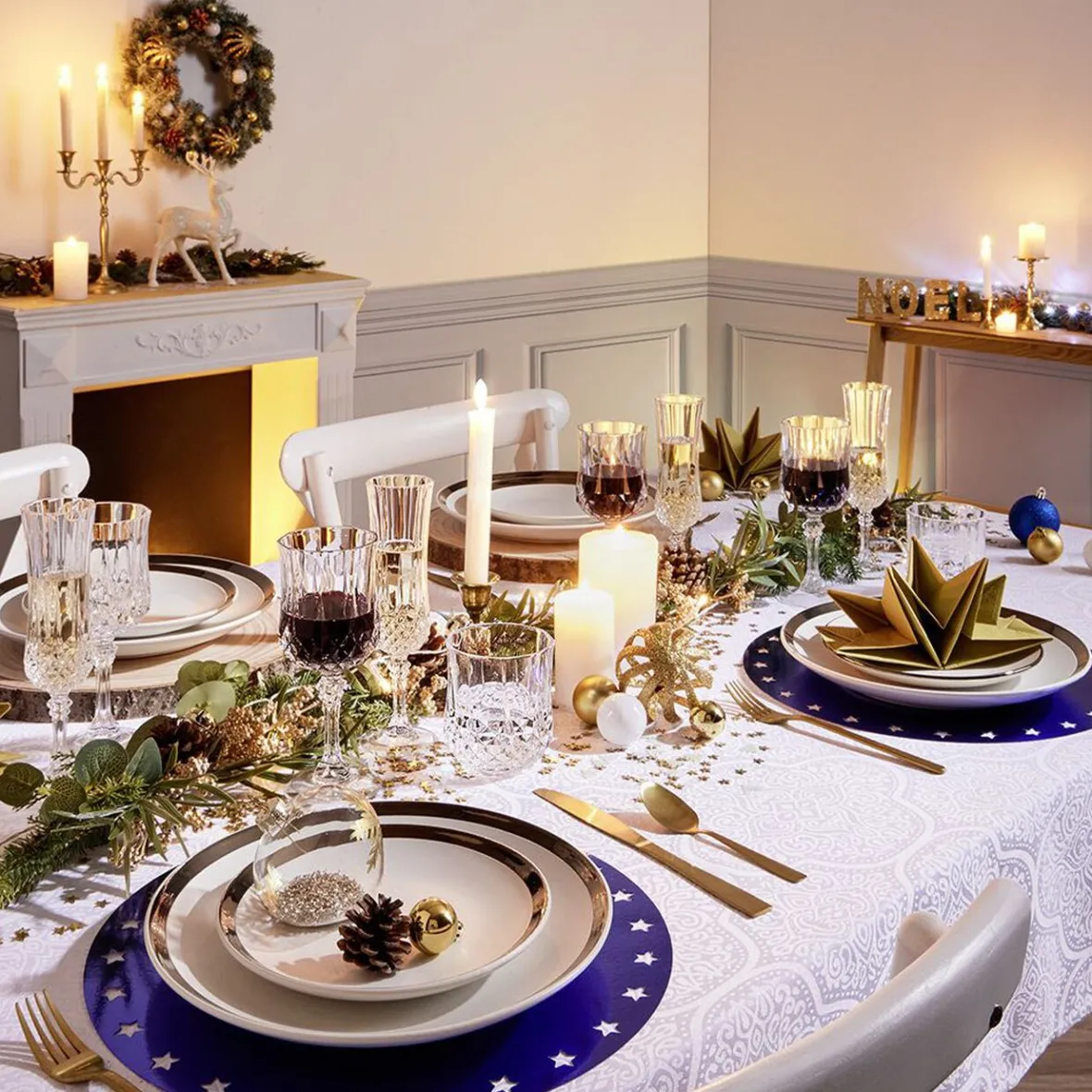 Set de 4 sous-assiettes en papier bleu avec décor Noël sur la bordure.