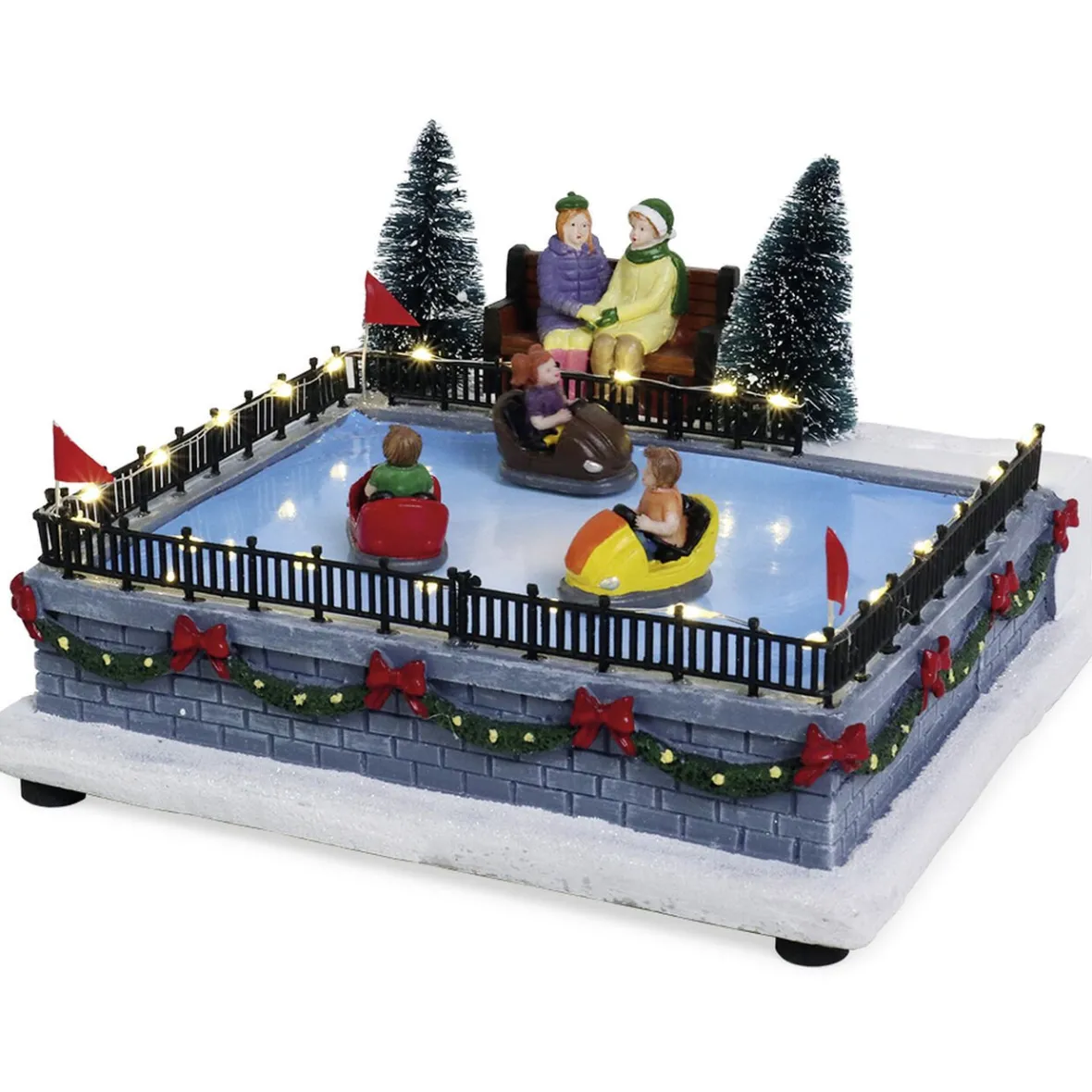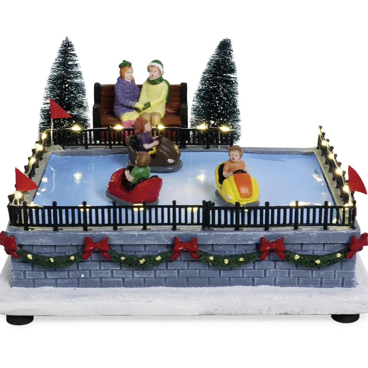 Scène musicale et lumineuse avec auto-tamponneuses animées, idéal pour égayer votre village de Noël avec un élément incontournable des fêtes foraines!