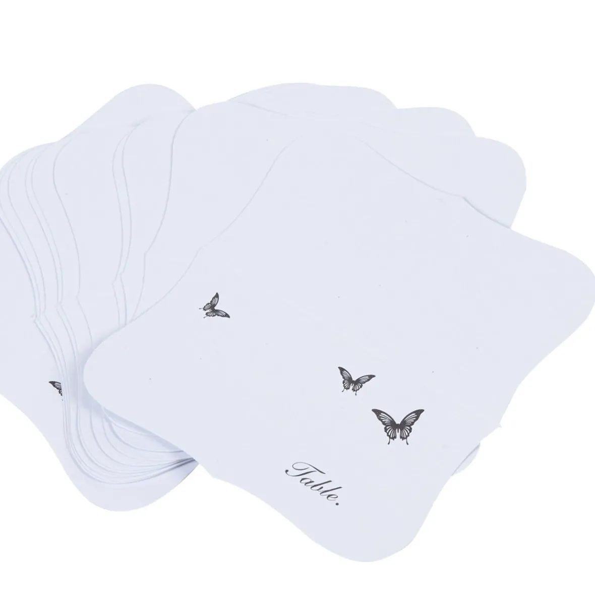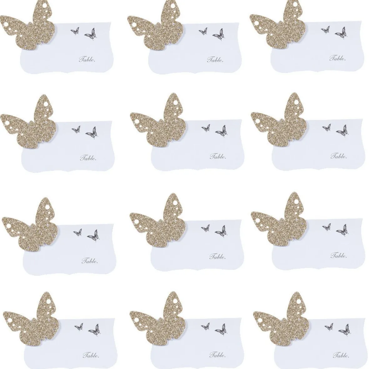 12 marques-places blancs en carton dim. 9×10 cm + 12 stickers papillons dorés pailletés en plastique dim. 5×4,5 cm.
