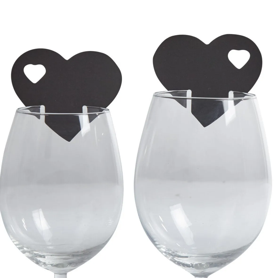 10 marque-verres en forme de coeur noir, dim. 7×6,5 cm, carton.
