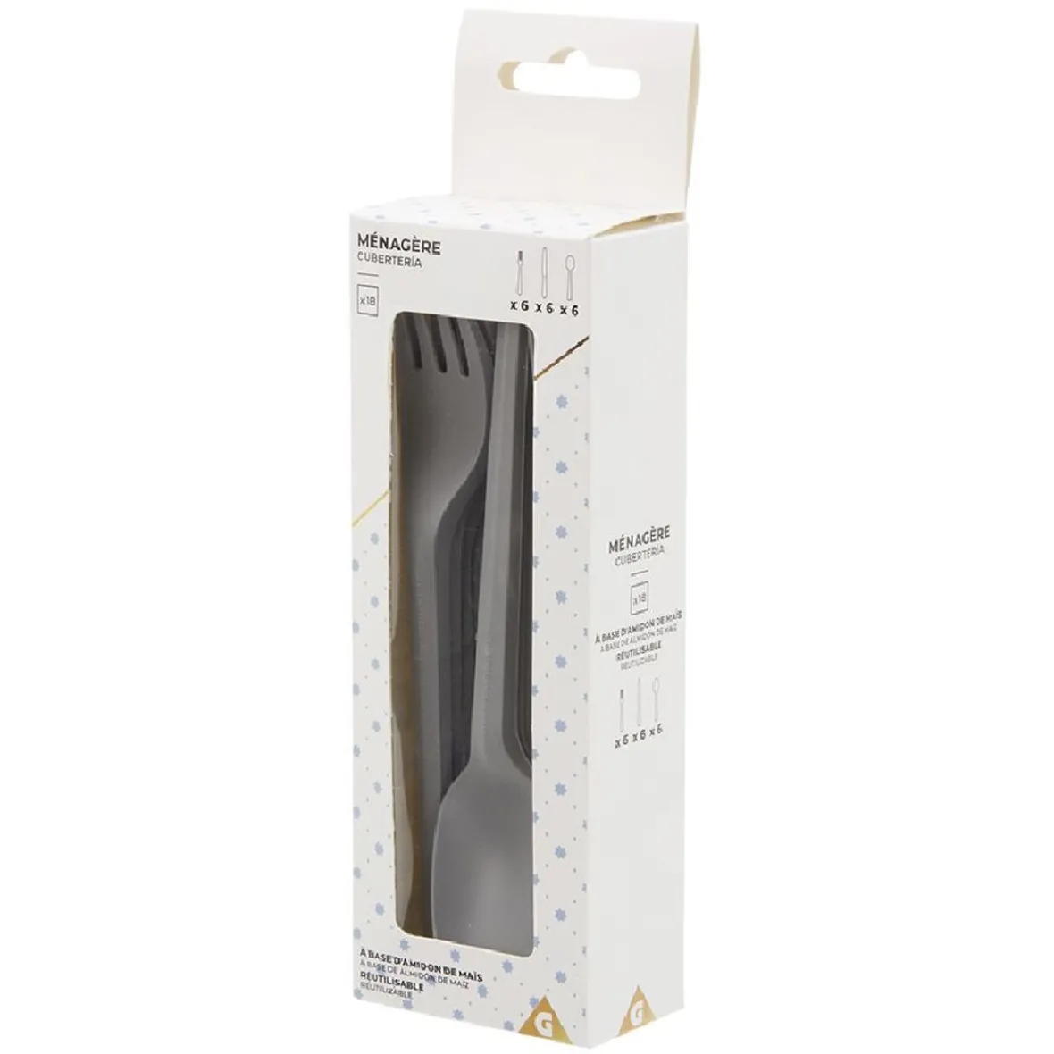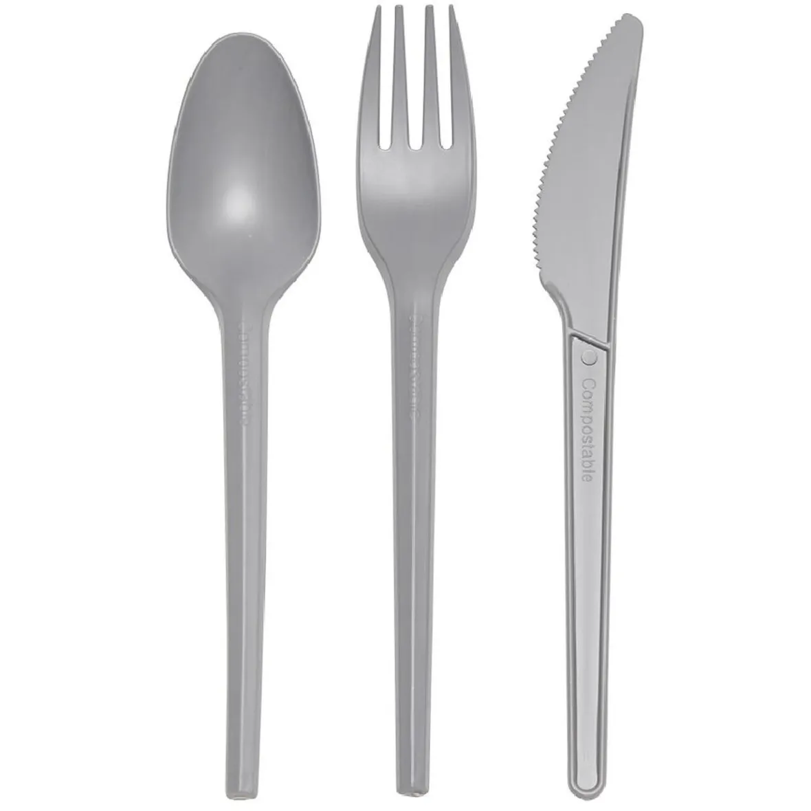 Ménagère en plastique végétal fait à partir d’amidon de maïs, réutilisable gris comprenant 6 fourchettes, 6 couteaux et 6 cuillères.