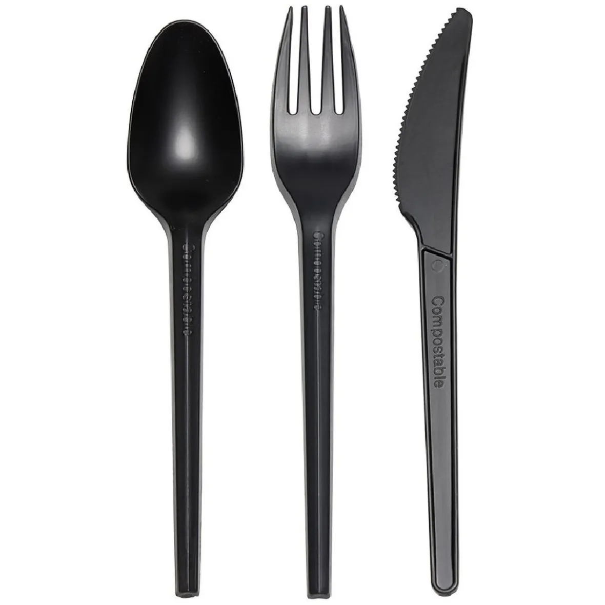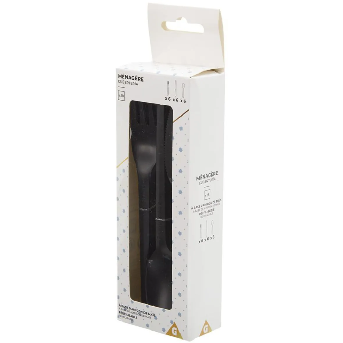 Ménagère en plastique végétal fait à partir d’amidon de maïs, réutilisable noir comprenant 6 fourchettes, 6 couteaux et 6 cuillères.