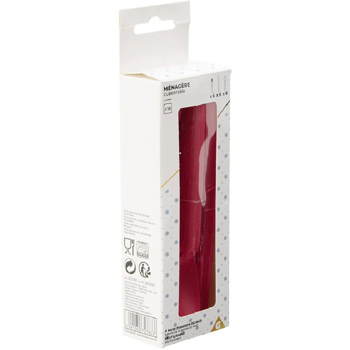 Ménagère en plastique végétal fait à partir d’amidon de maïs, réutilisable rouge comprenant 6 fourchettes, 6 couteaux et 6 cuillères.